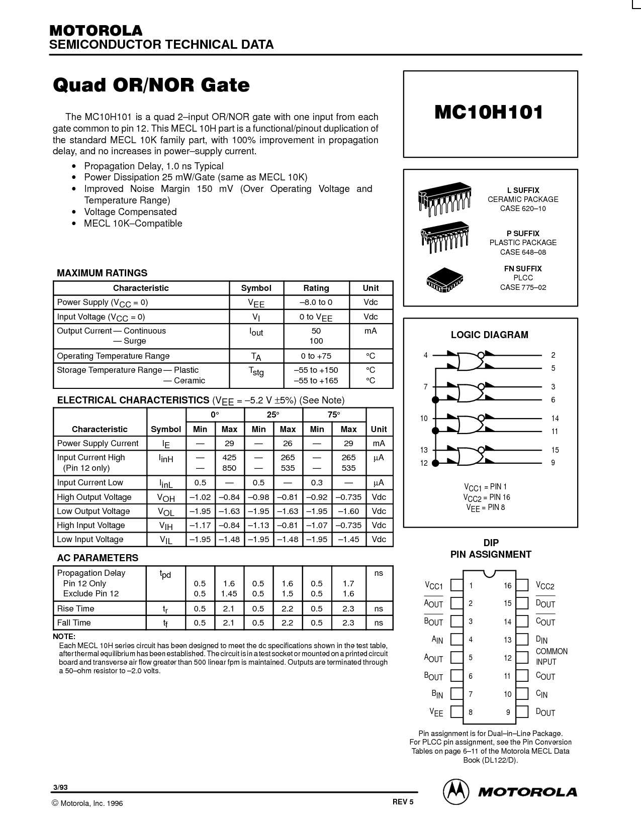 这 mc10h101 是 一个 四边形 2–input 或/也没有 闸门 与 一个 输入 从 每个