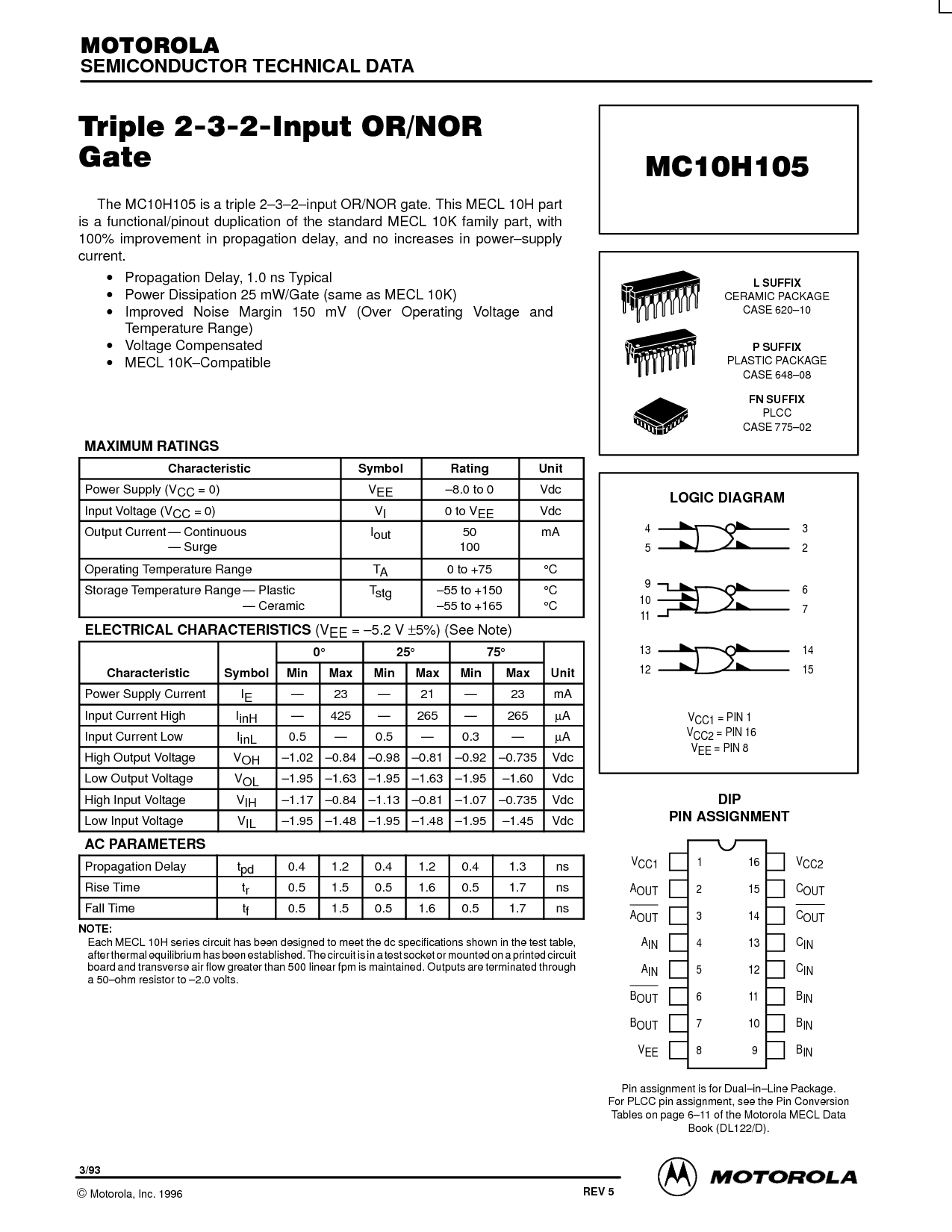 这 mc10h105 是 一个 三倍 2–3–2–input 或/也没有 闸门. 这个 mecl 10h 零件