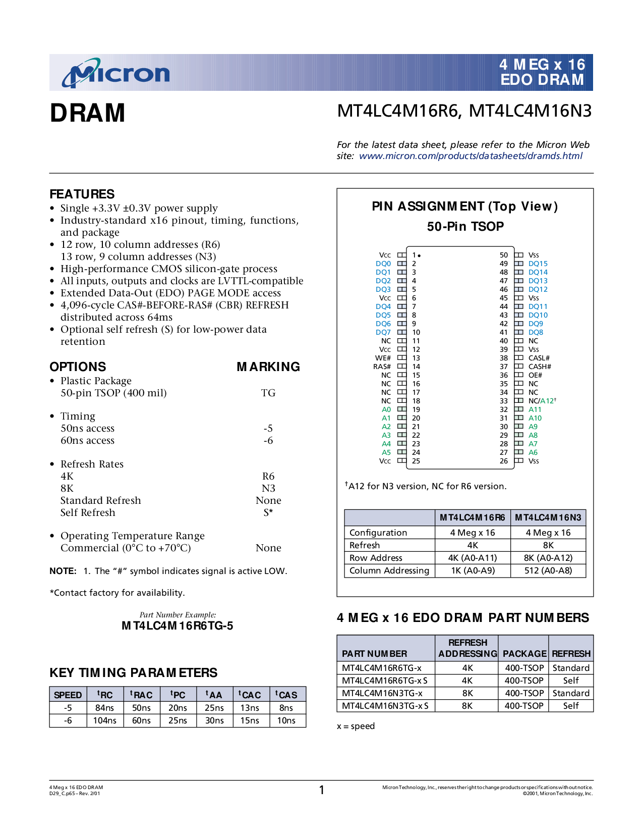 4 meg x 16 edo dram 微米 技术, 股份有限公司., 储备金 这 右侧 至 变更 产品 或 规格 无 通知.