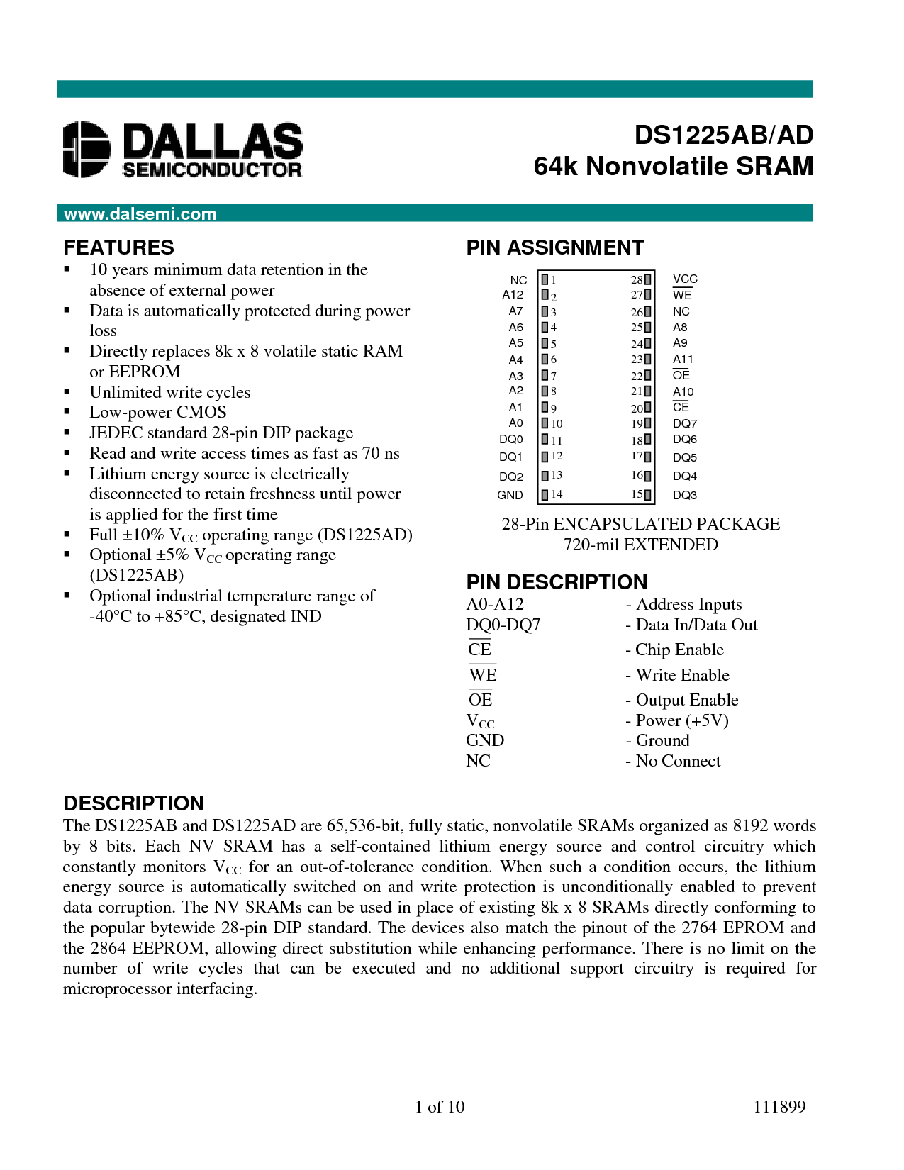 这 ds1225ab 和 ds1225ad 是 65,536-有点, 完全 静态, 非挥发性 srams 有组织的 作为 8192 字词