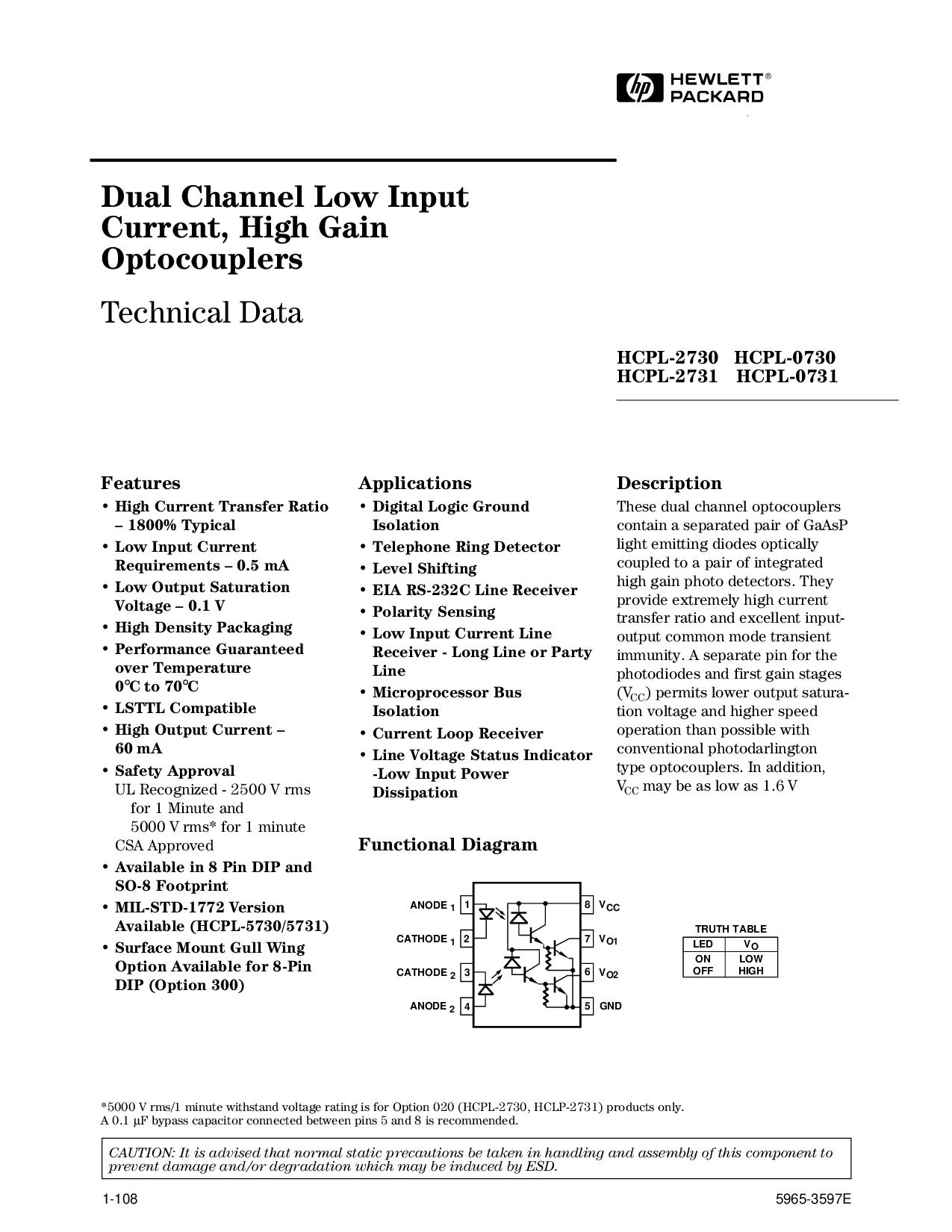 *5000 v rms/1 分钟 承受 电压 评级 是 用于 选项 020 (hcpl-2730, hclp-2731) 产品 仅.