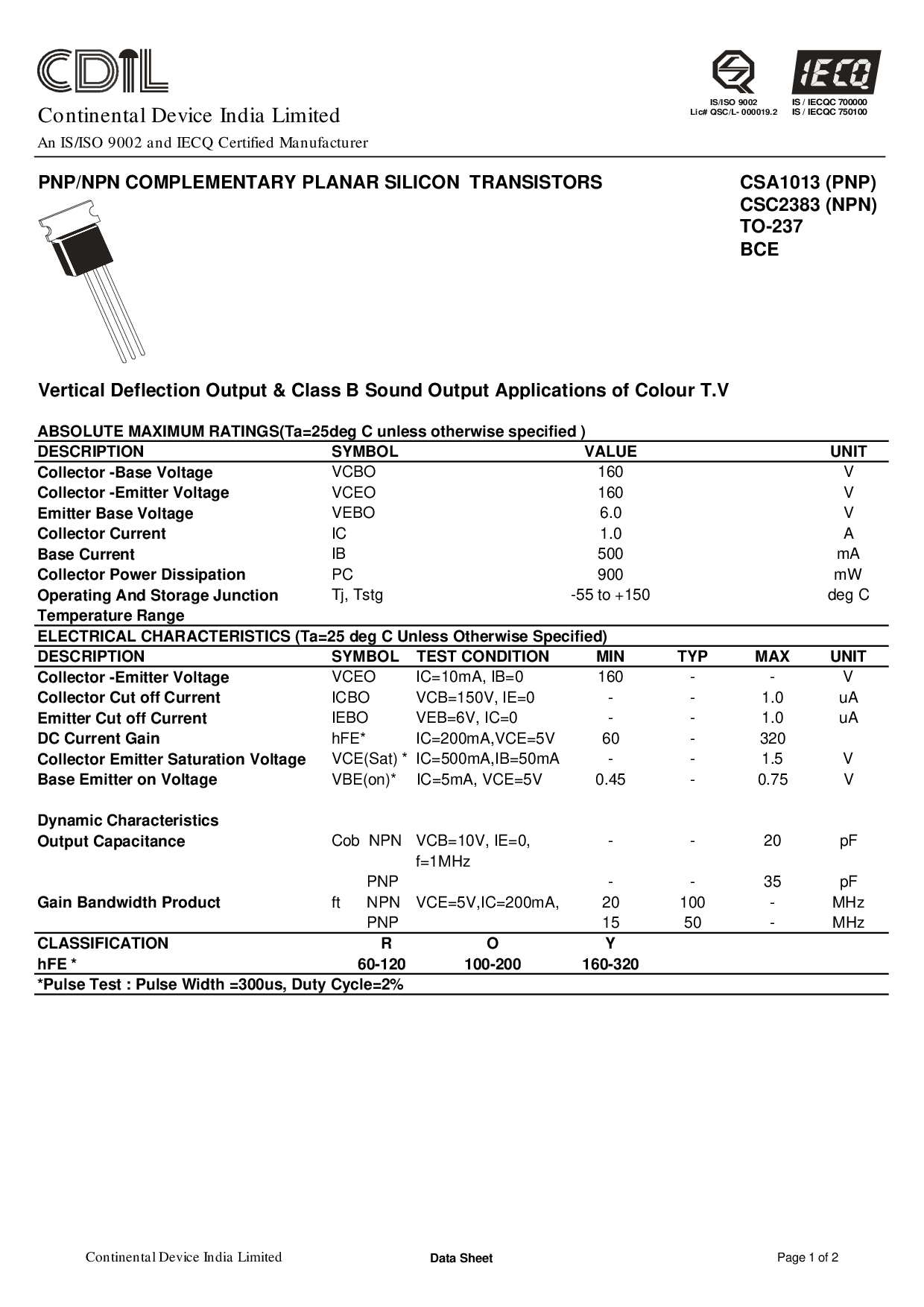 pnp/npn 互补 平面 硅 晶体管 csa1013 (pnp)