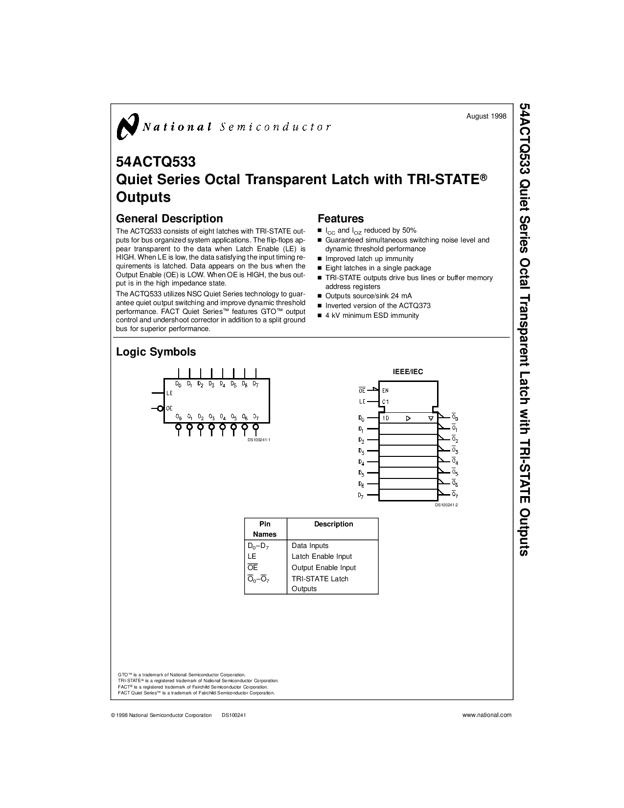54ACTQ533 安静 系列 八进制 透明 门闩 与 三态 产出