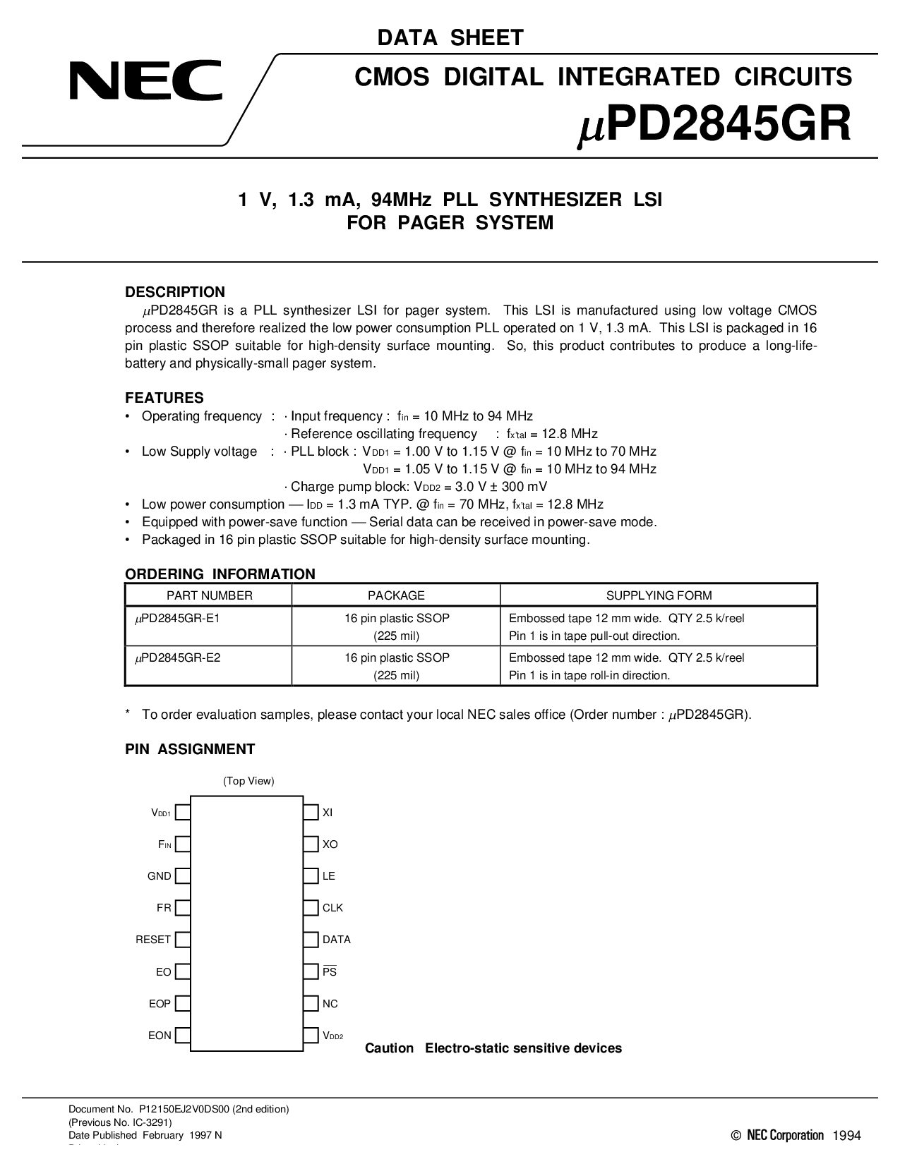 pd2845gr 是 一个 pll 合成器 lsi 用于 pager 系统. 这个 lsi 是 已制造 使用 低 电压 cmos