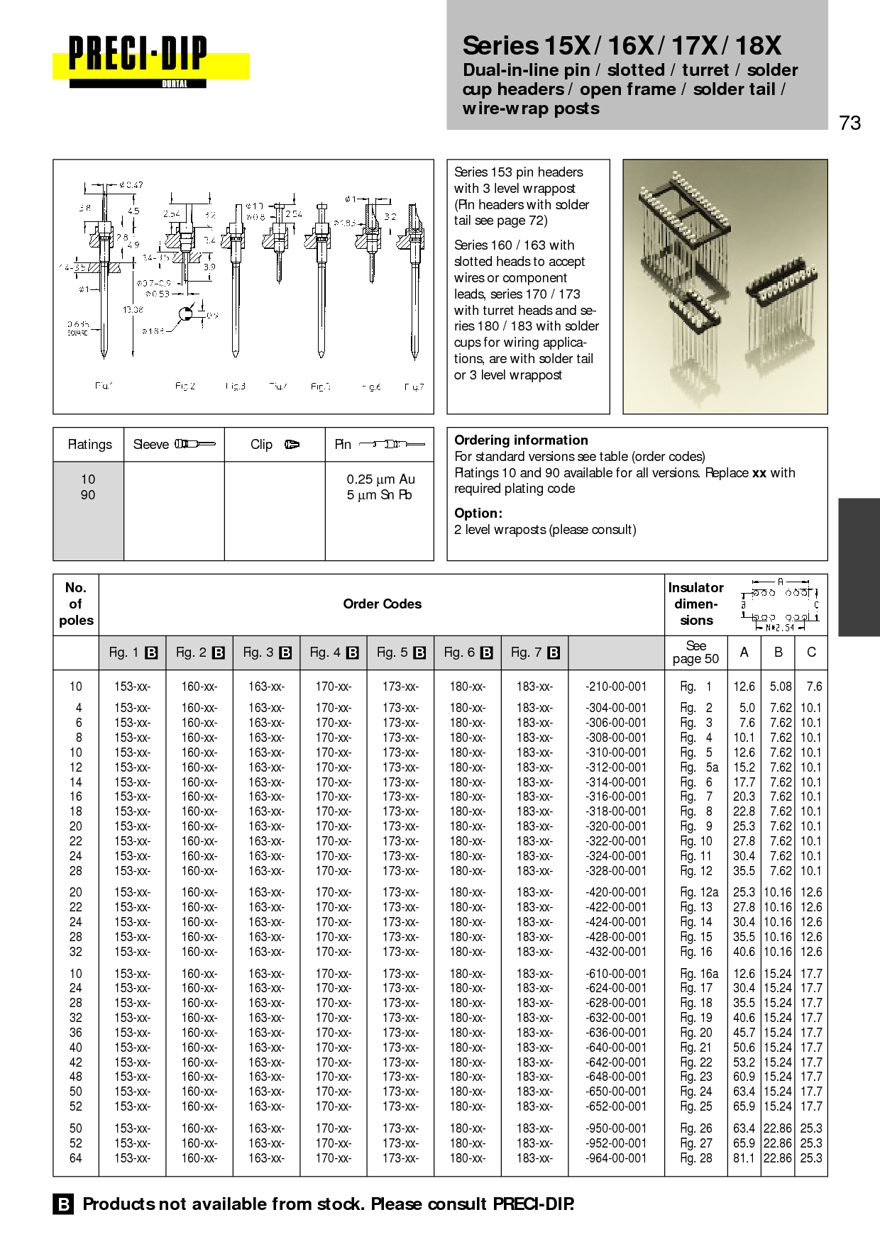 Dual-in-line pin / slotted / turret / solder cup headers / open frame / solder tail / wire-wrap posts