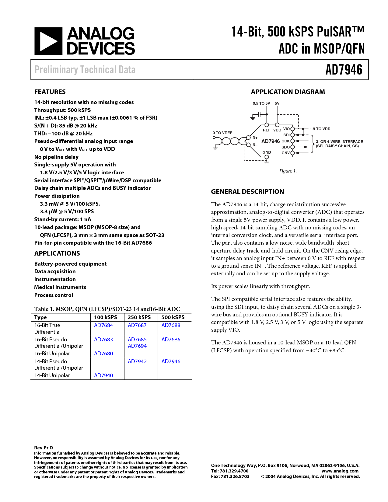 表 1. msop, qfn (lfcsp)/sot-23 14 and16-有点 adc