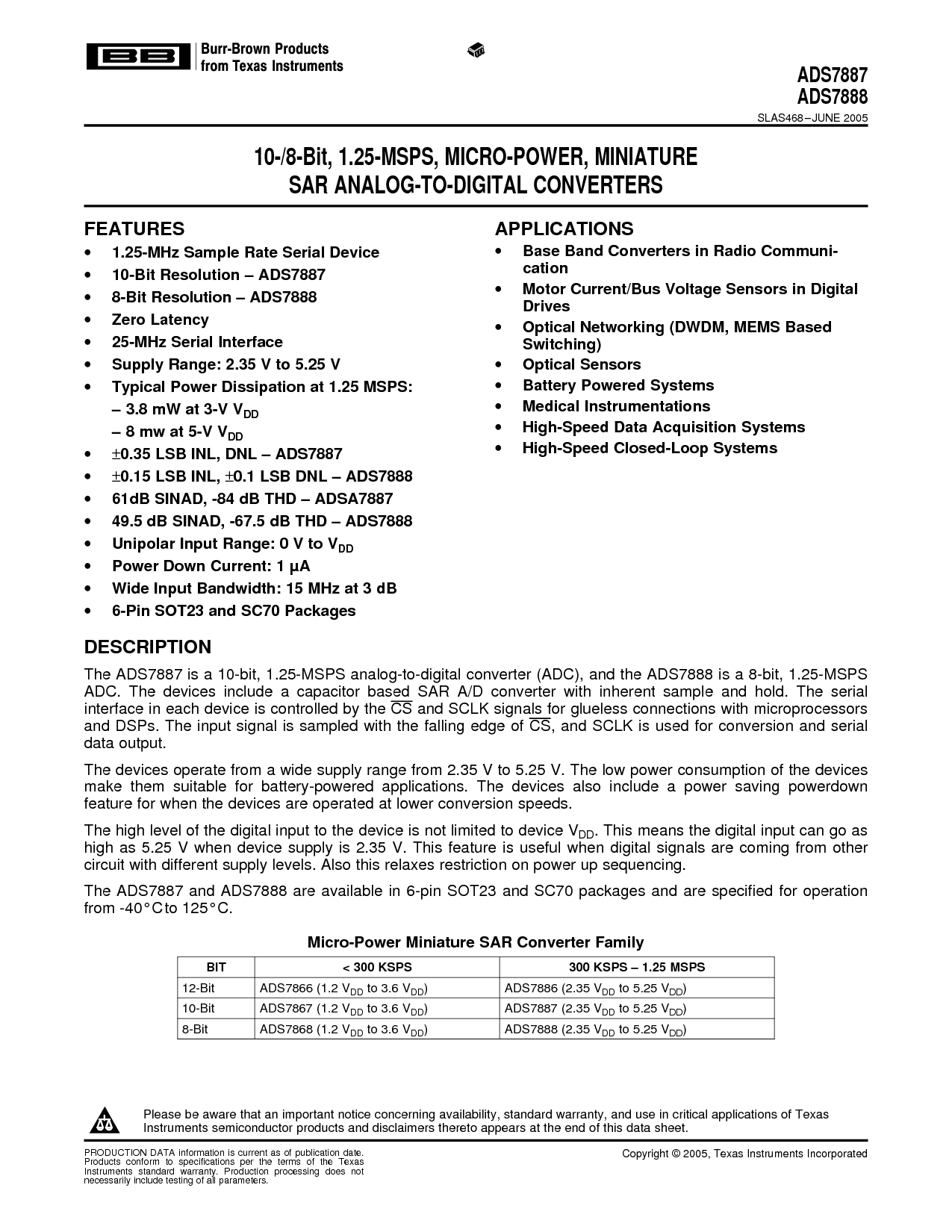 theads7887isa10-有点,1.25-mspsanalog-至-digitalconverter(adc),andtheads7888isa8-有点,1.25-msps