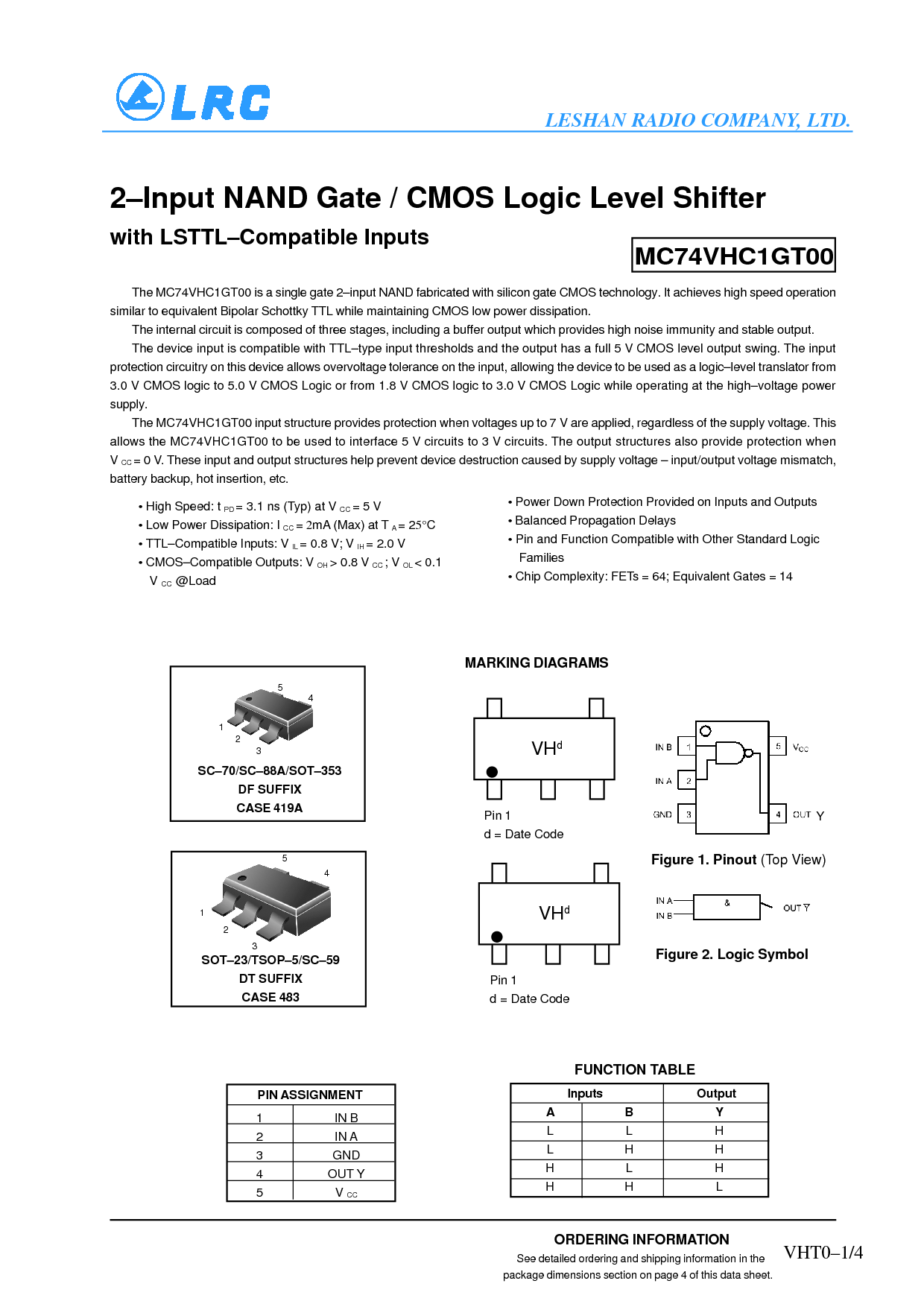 这 mc74vhc1gt00 是 一个 单独 闸门 2–input 与非 预制 与 硅 闸门 cmos 技术. 它 达到 高 速度 操作