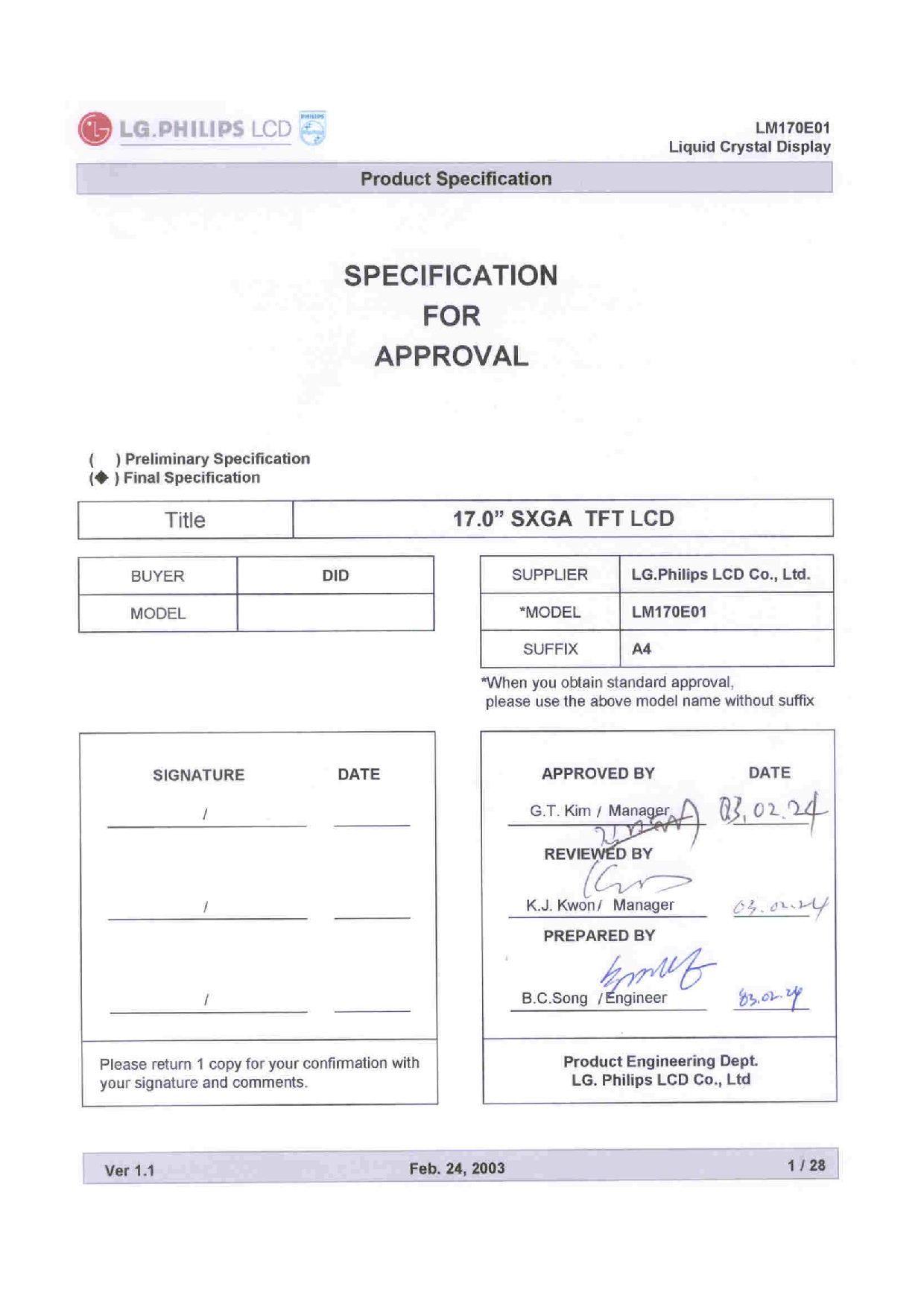 产品 规格 1/ 28 LM170E01 液体 水晶 显示 ver 1.1 二月. 24, 2003 | |