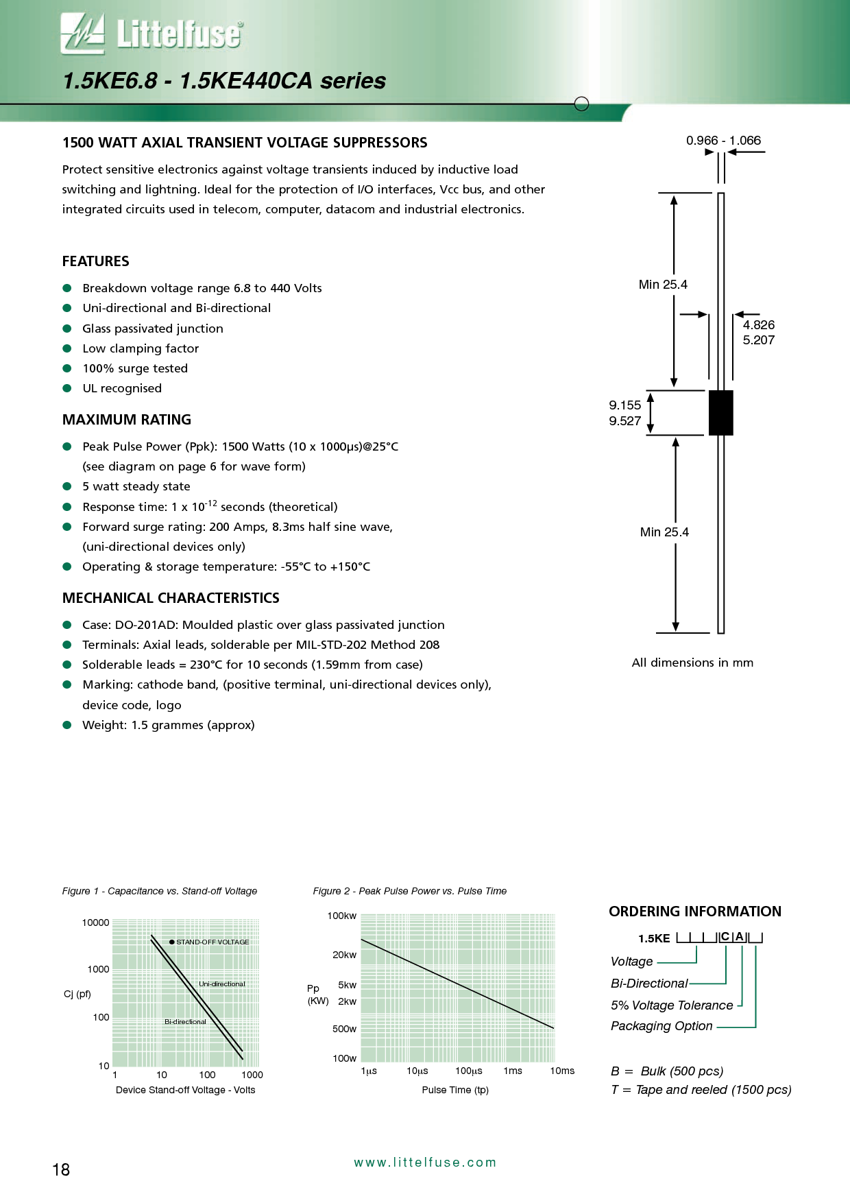峰值 脉冲 电源 (ppk): 1500 瓦特 (10 x 1000µs)@25°c