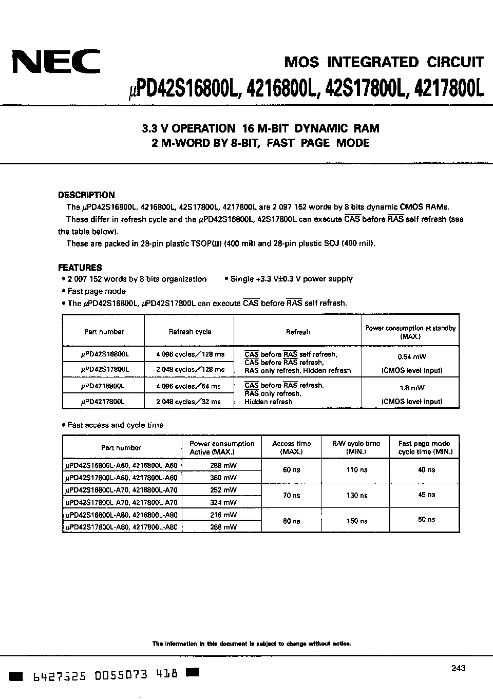 3.3 V OPERATION 16 M-BIT DYNAMIC RAM 2 M-WORD BY 8-BIT, FAST PAGE MODE