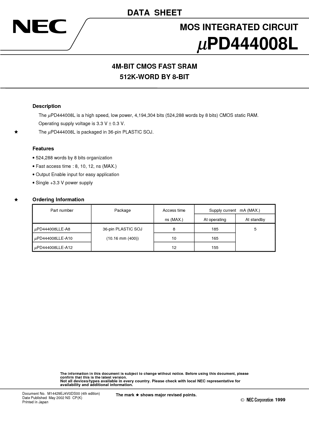 pd444008l 是 一个 高 速度, 低 电源, 4,194,304 比特 (524,288 字词 由 8 bits) cmos 静态 ram.