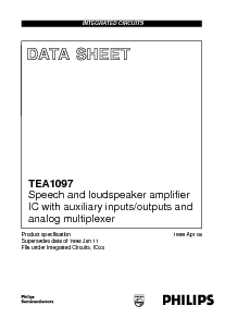 dat一个shEET 产品 Speci 取代 数据 的 1998 六月 11 文件 下 综合 电路, ic03 1999 Apr 08 综合 电路 TEA1097 演讲 和 扬声器 放大器 集成电路 与 辅助 输入/产出 和 模拟 多路复用器 | |