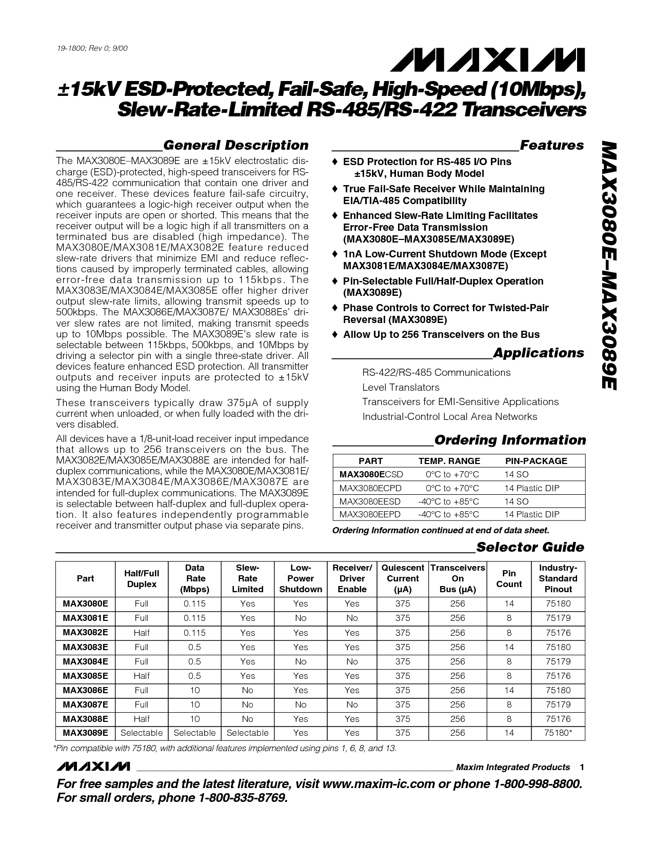 用于 免费 样品 和 这 最新 文学, 参观 www.马克西姆-集成电路.com 或 电话 1-800-998-8800.