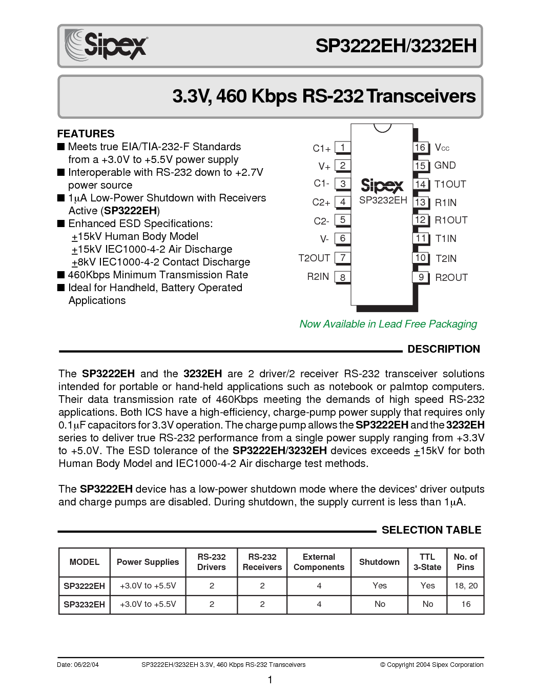 日期: 06/22/04 sp3222eh/3232eh 3.3v, 460 kbps rs-232 收发器 © 版权 2004 sipex 公司