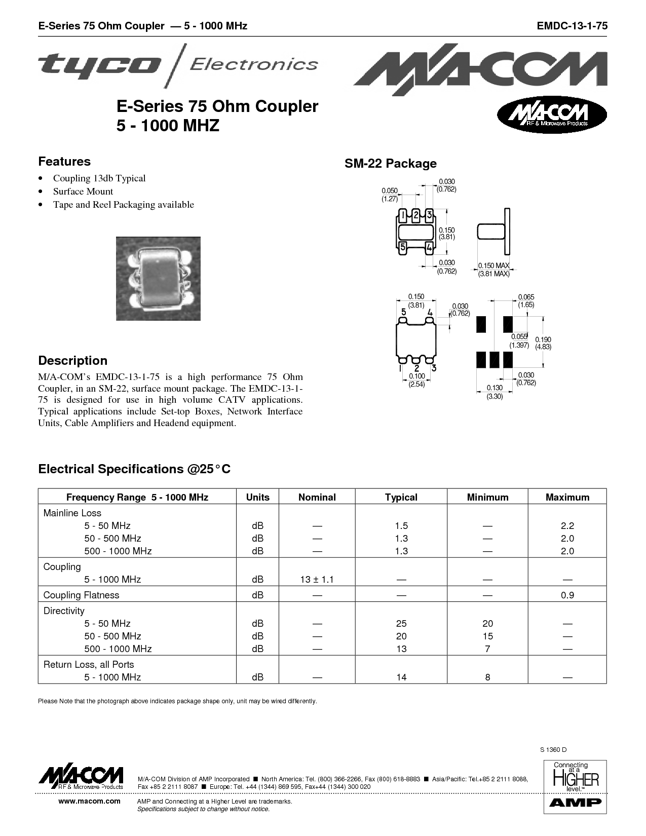 耦合器, 入点 一个 sm-22, 表面 安装 包装. 这 emdc-13-1-