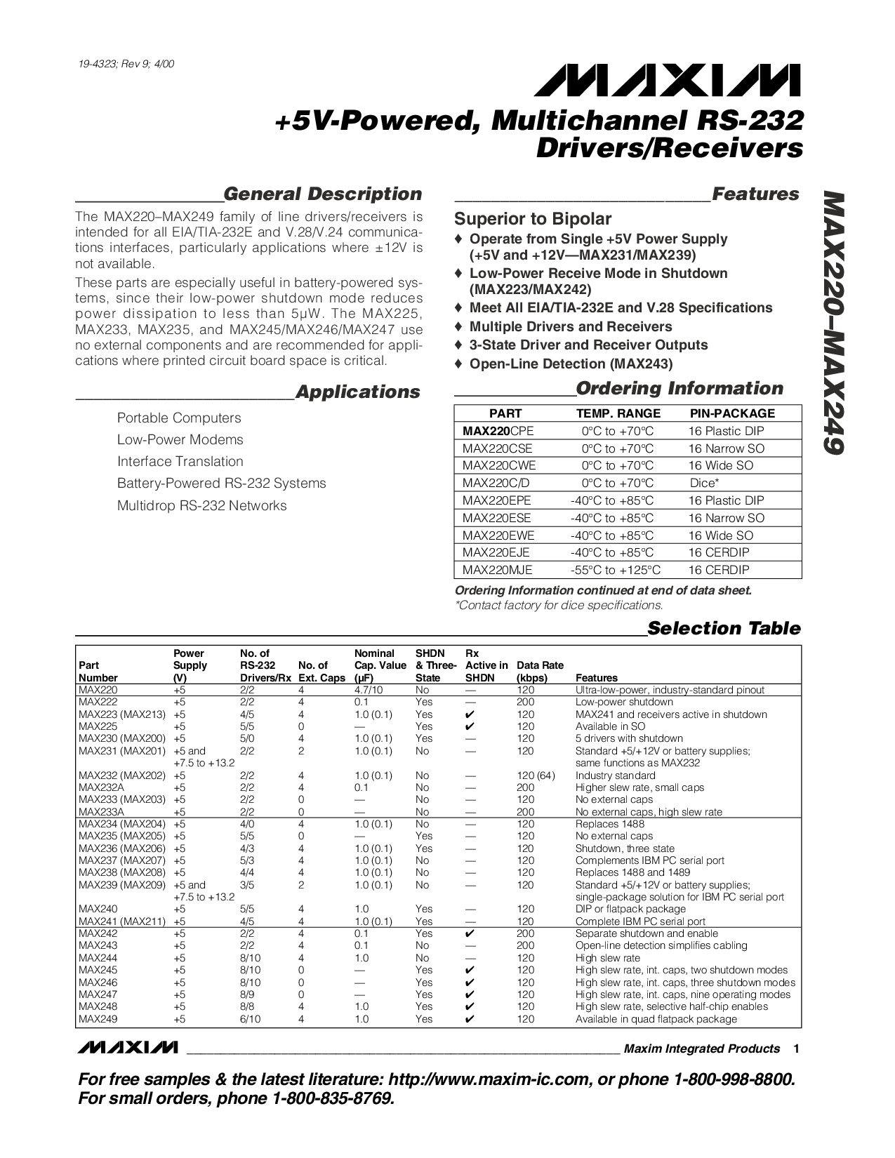 这 max220–max249 家庭 的 线 驱动程序/接收器 是