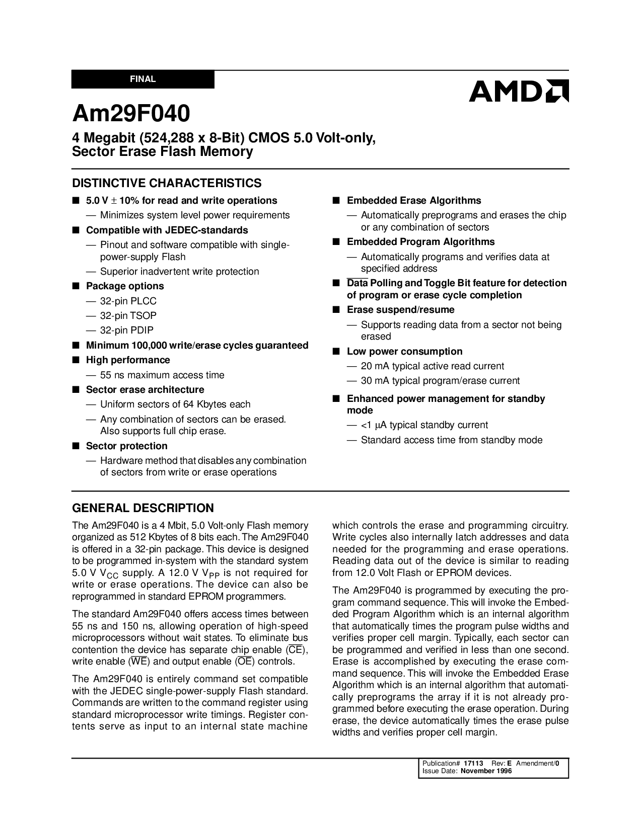 这 am29f040 是 一个 4 mbit, 5.0 仅电压 闪光灯 记忆