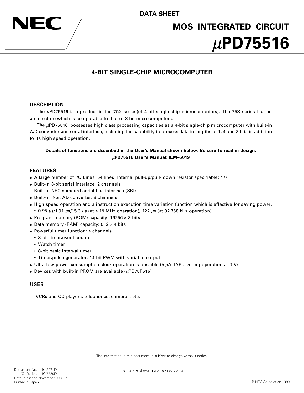pd75516 拥有 高 类 加工 容量 作为 一个 4-有点 单芯片 微型计算机 与 内置