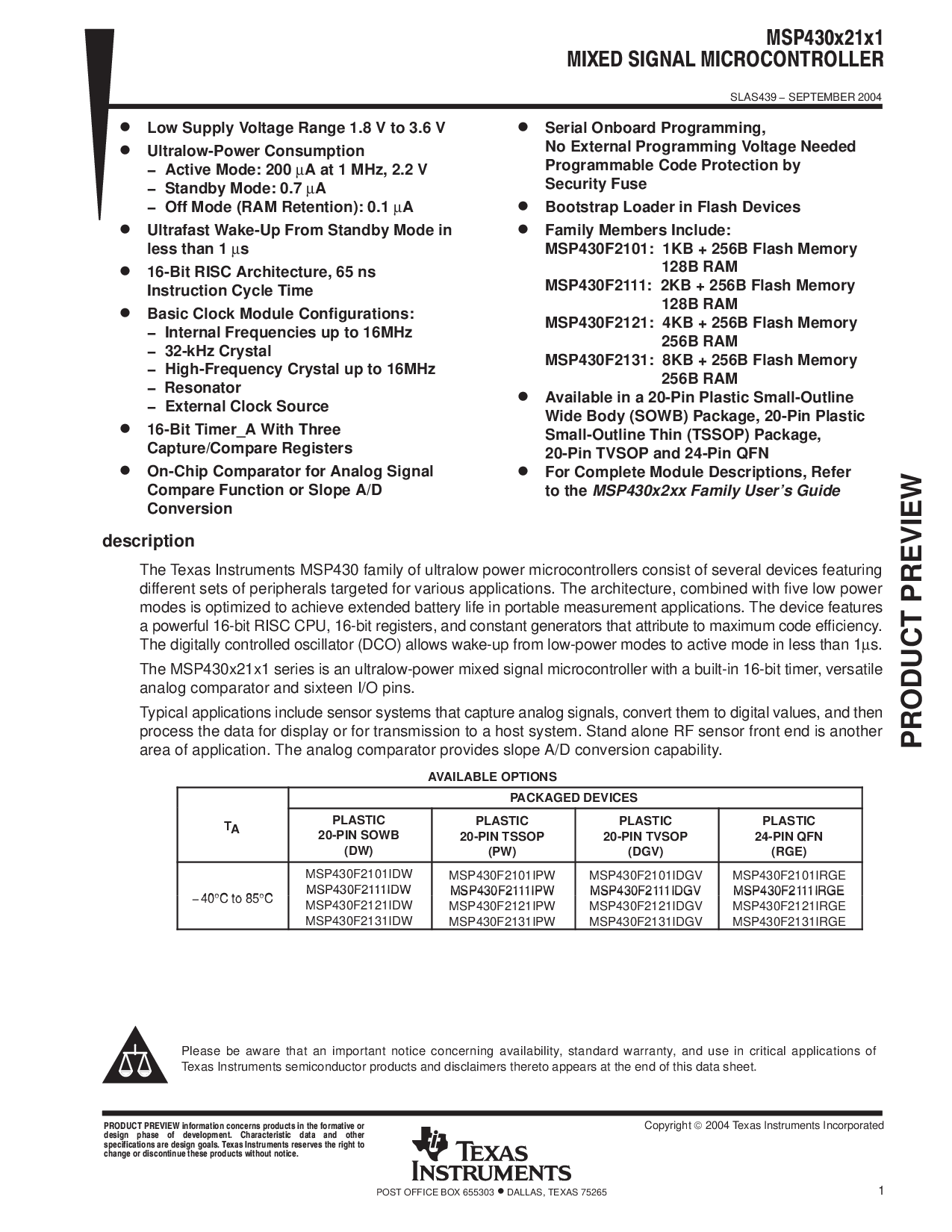 这 msp430x21x1 系列 是 一个 超低功耗 混合 信号 微控制器er 与 一个 内置16-有点 计时器, 多才多艺