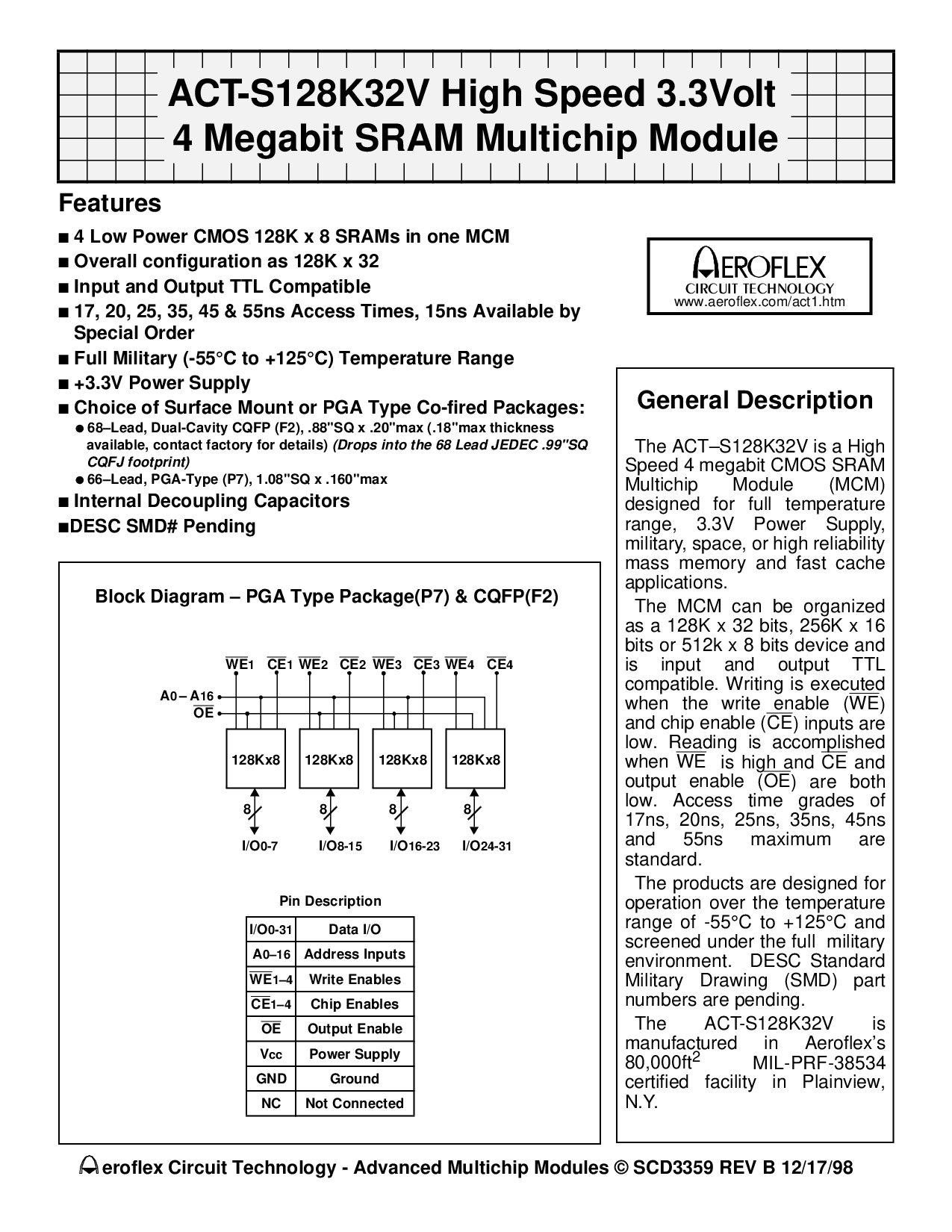 ACT-S128K32V High Speed 3.3Volt 4 Megabit SRAM Multichip Module