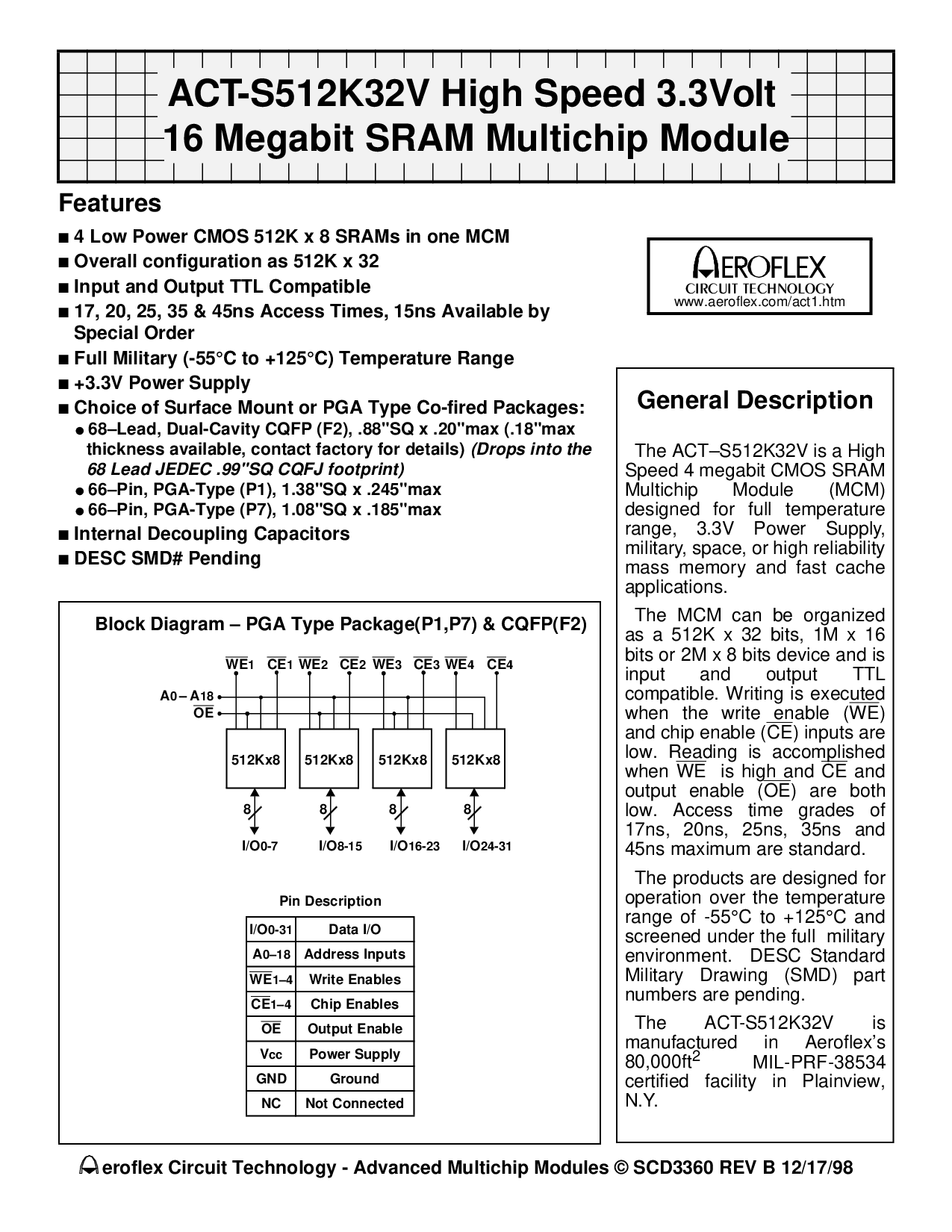 ACT-S512K32V High Speed 3.3Volt 16 Megabit SRAM Multichip Module