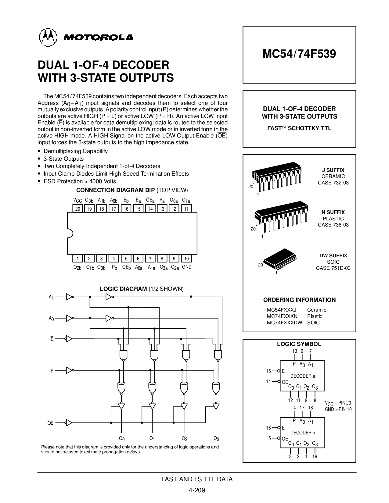 这MC54/74f539 包含 两个 独立 解码器. 每个 接受 两个