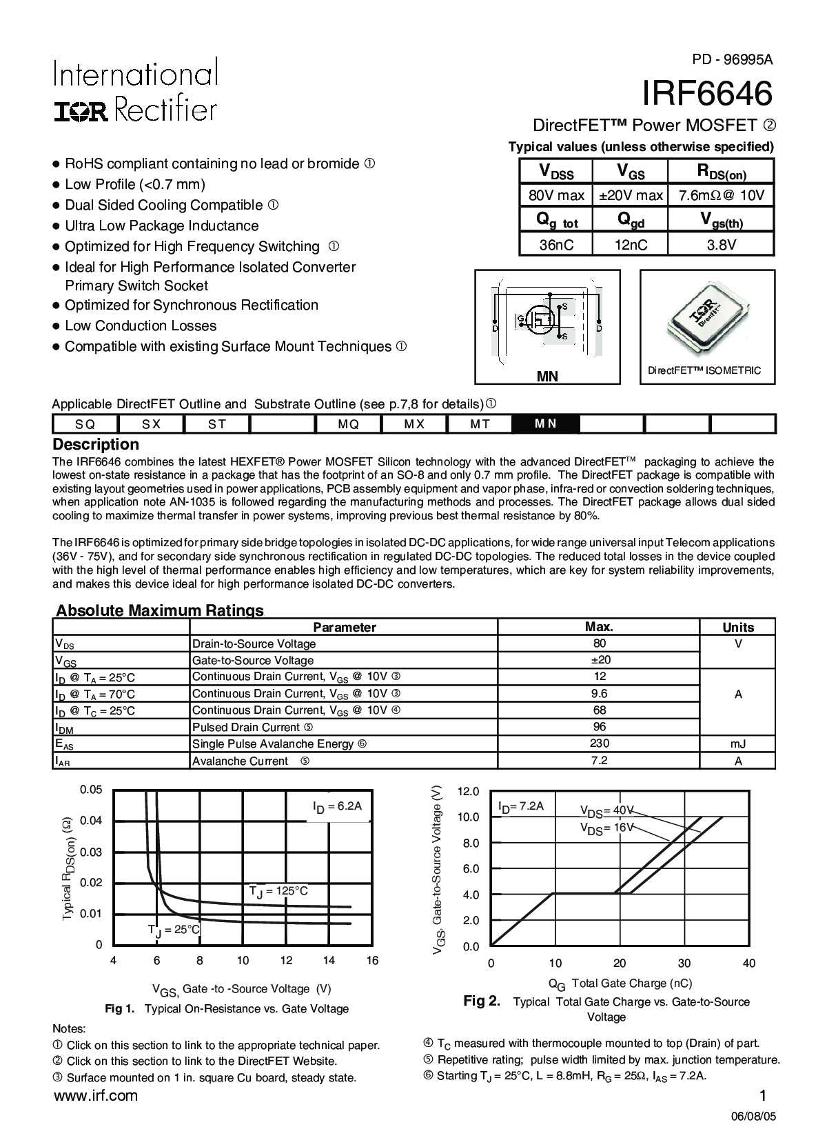 这 irf6646 是 优化 用于 主要 侧面 桥梁 拓扑 入点 隔离 直流-直流 应用程序, 用于 宽 范围 通用 输入 电信 应用程序