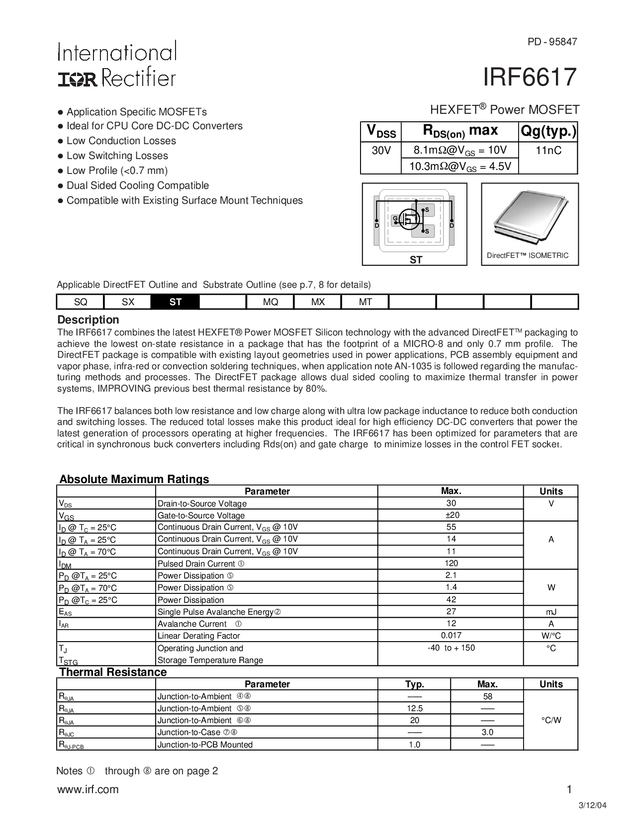 这 irf6617 余额 两者都有 低 电阻 和 低 费用 沿 与 超 低 包装 电感 至 减少 两者都有 传导