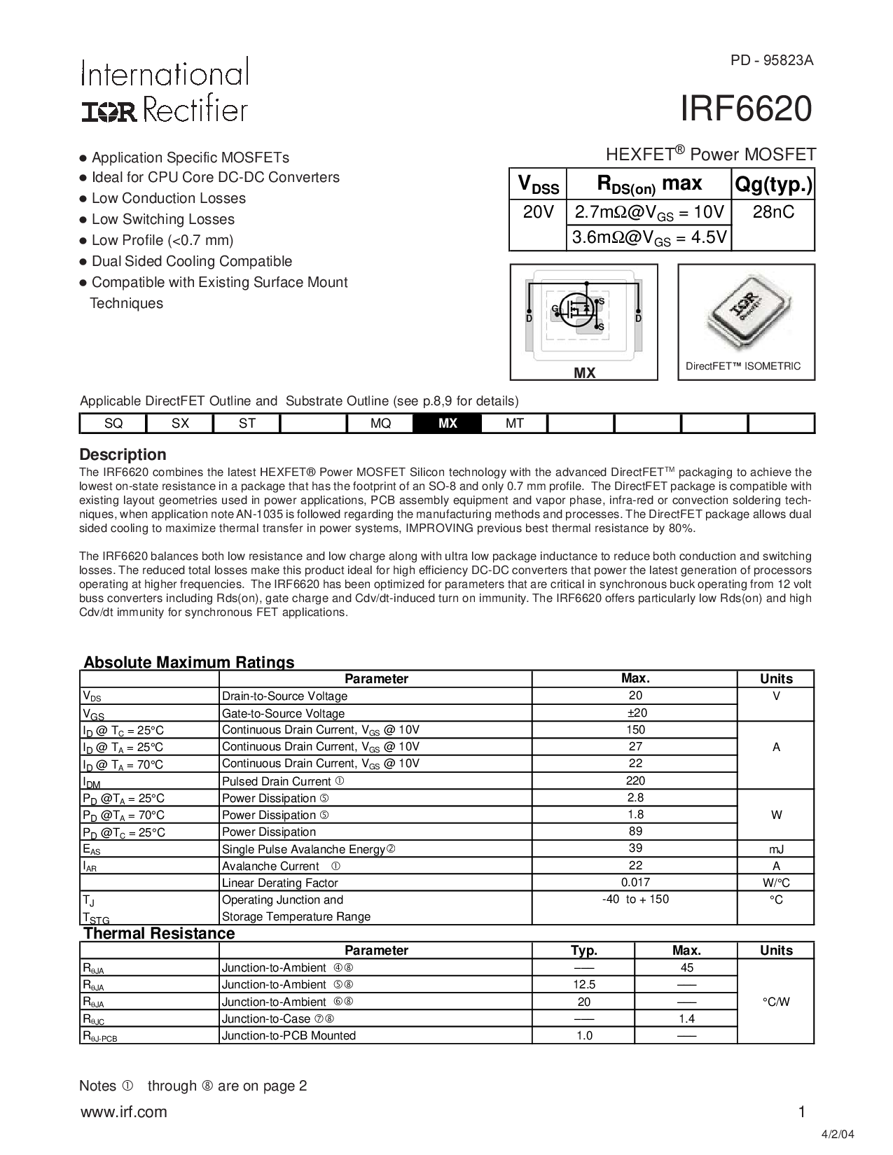 总线 转换器 包括 rds(开启), 闸门 费用 和 cdv/dt-诱导 转弯 开启 免疫. 这 irf6620 优惠 特别是 低 rds(开启)和 高