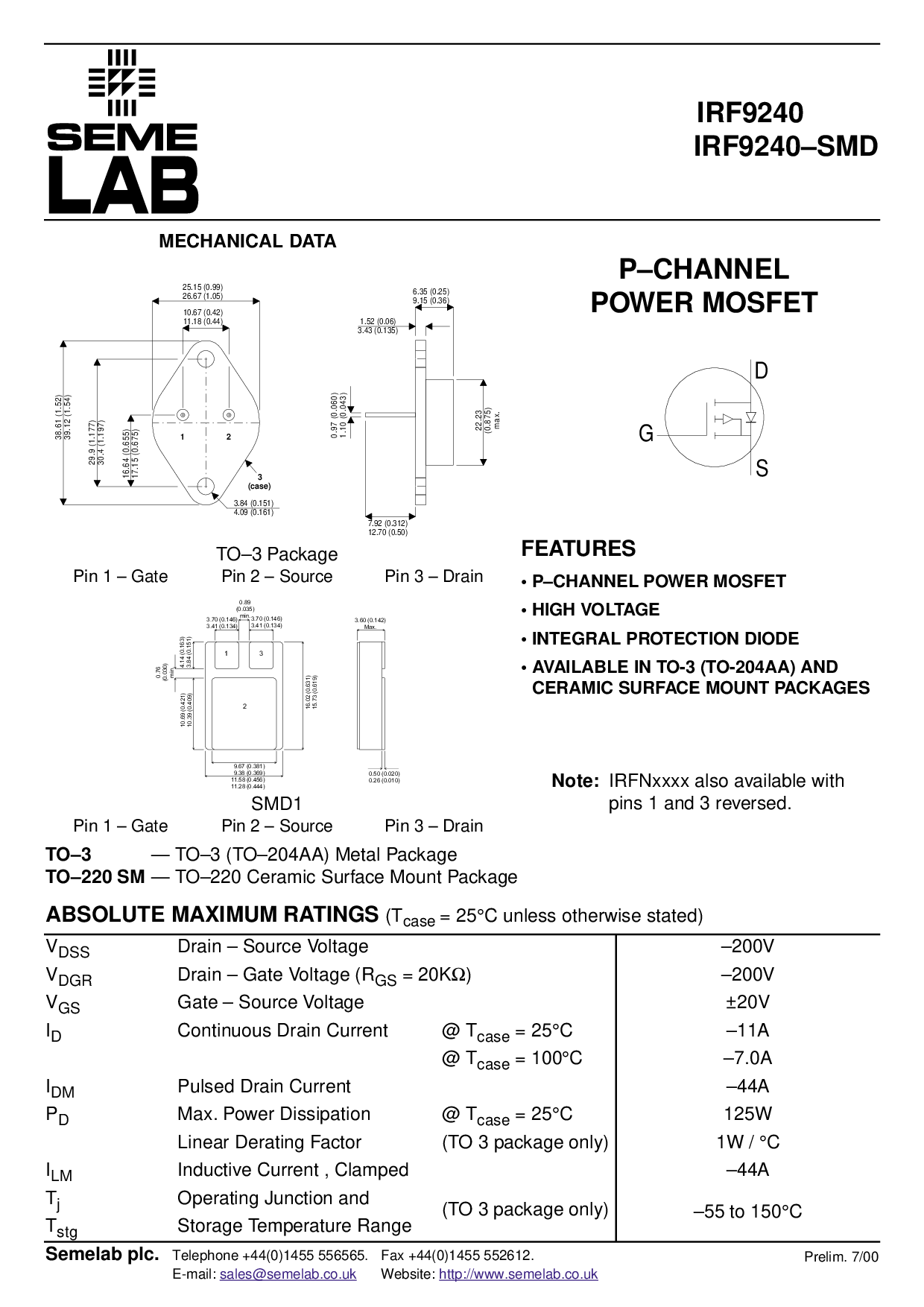 浏览型号IRF9240-SMD的Datasheet PDF文件第2页