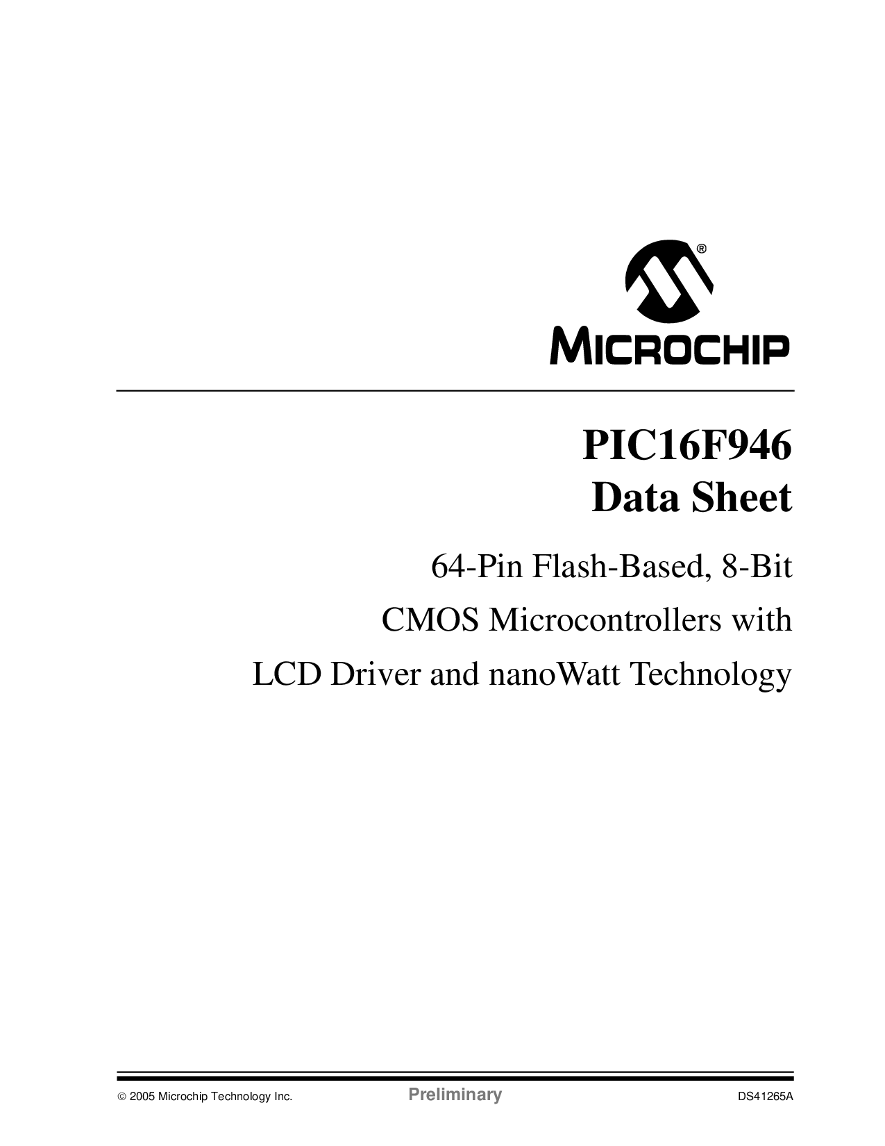 © 2005 微芯片 技术 公司 初步 DS41265A PIC16F946 数据 工作表 64-管脚 闪光灯-基于, 8-有点 cmos 微控制器 与 lcd 驾驶员 和 nanowatt 技术 | |