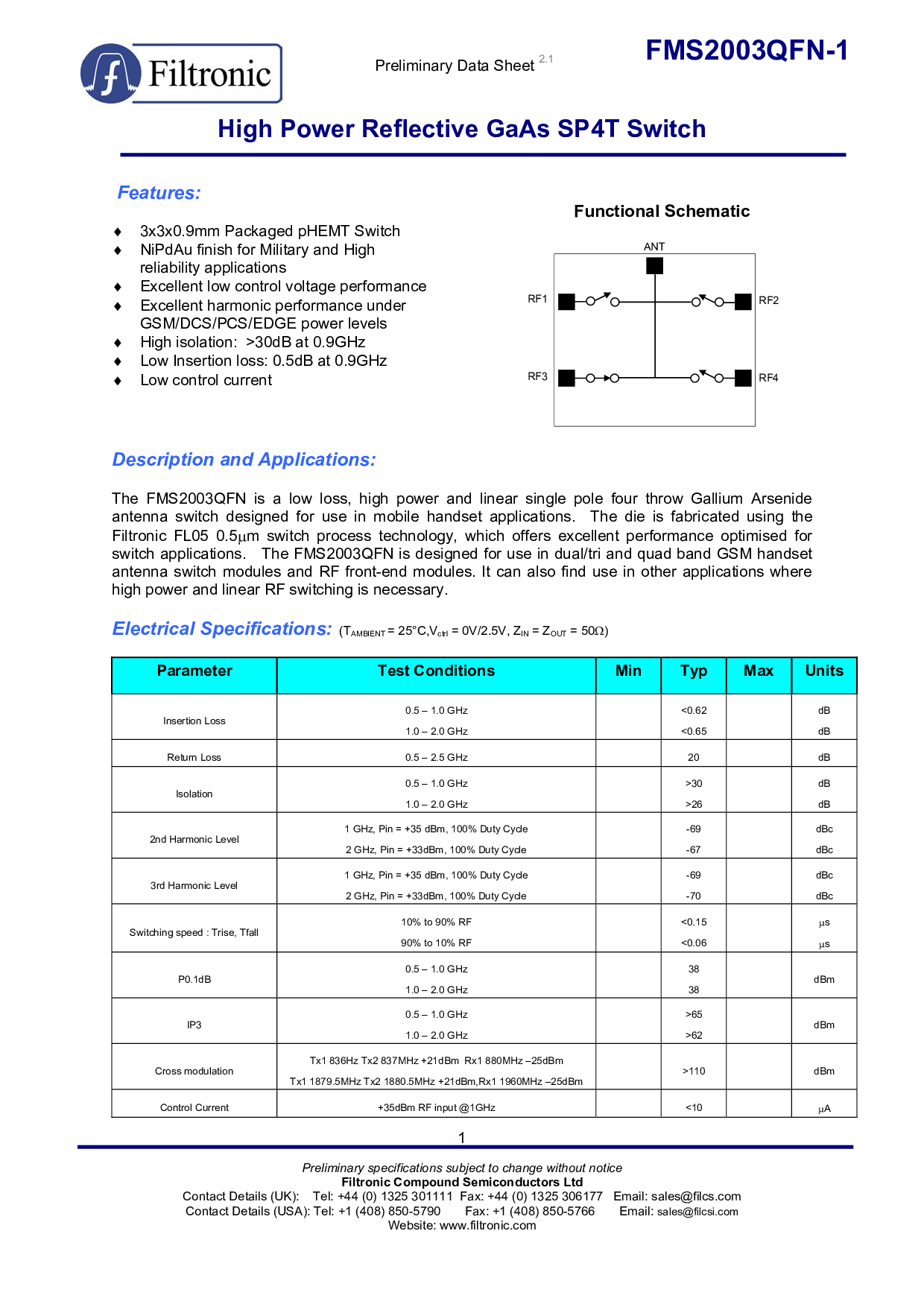 这 fms2003qfn 是 一个 低 损失, 高 电源 和 线性 单独 杆 四 投掷 镓 砷化物