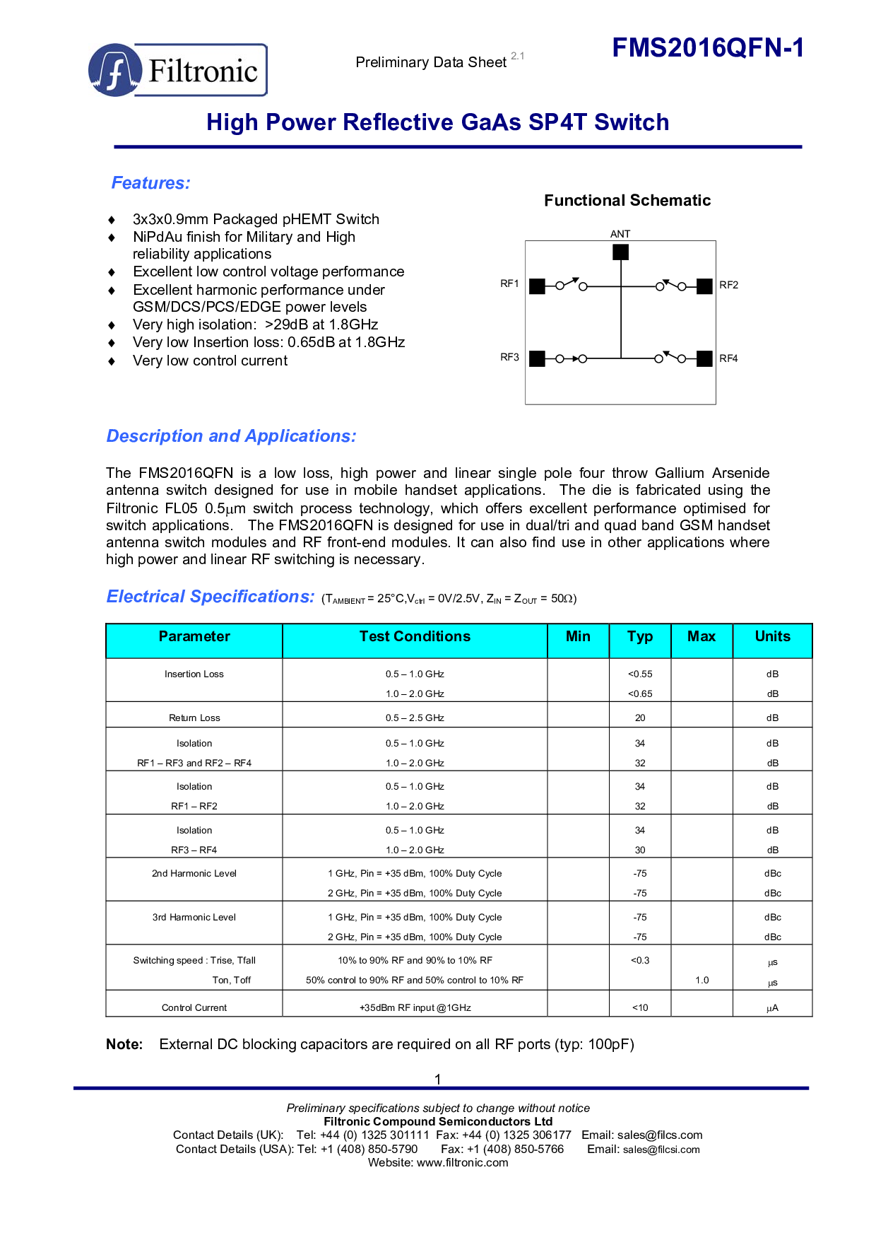 这 fms2016qfn 是 一个 低 损失, 高 电源 和 线性 单独 杆 四 投掷 镓 砷化物