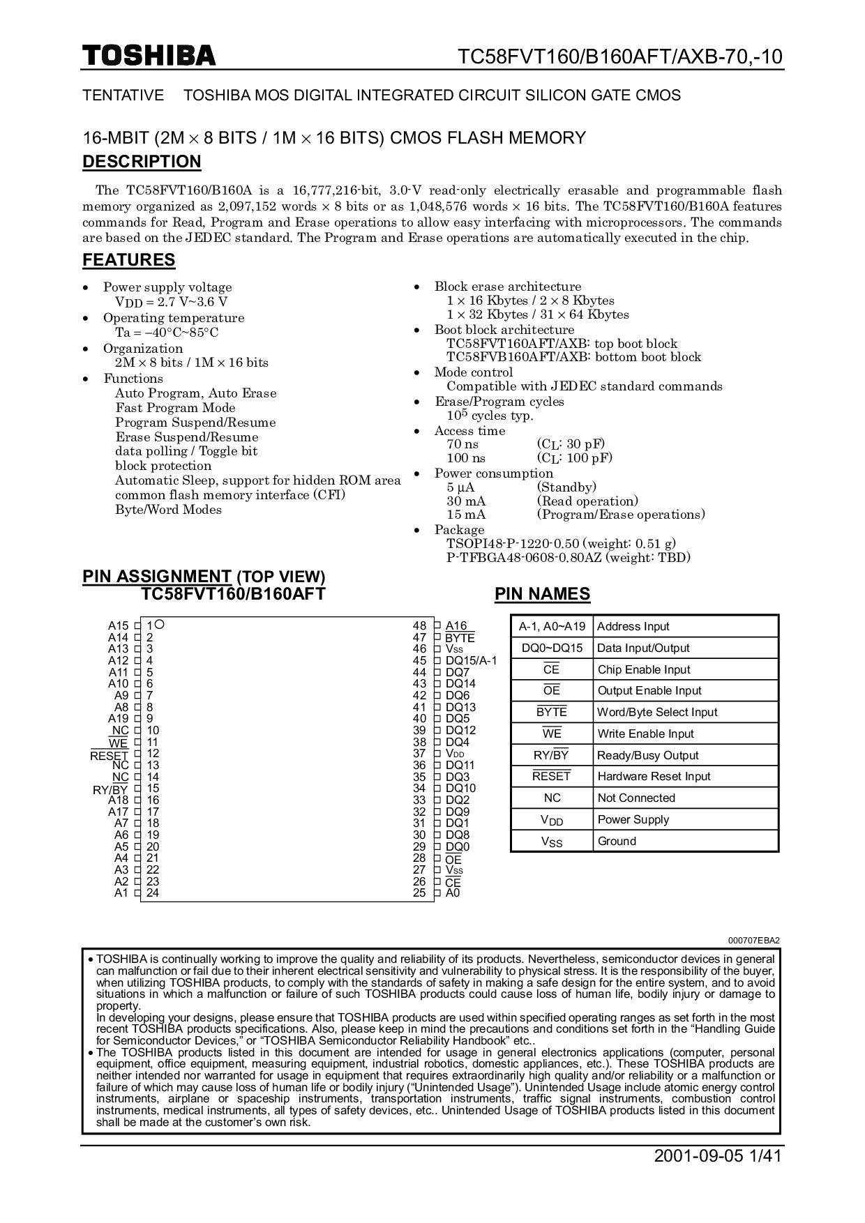 这 tc58fvt160/b160a 是 一个 16,777,216-有点, 3.0-v 只读 电气 可擦除 和 可编程 闪光灯