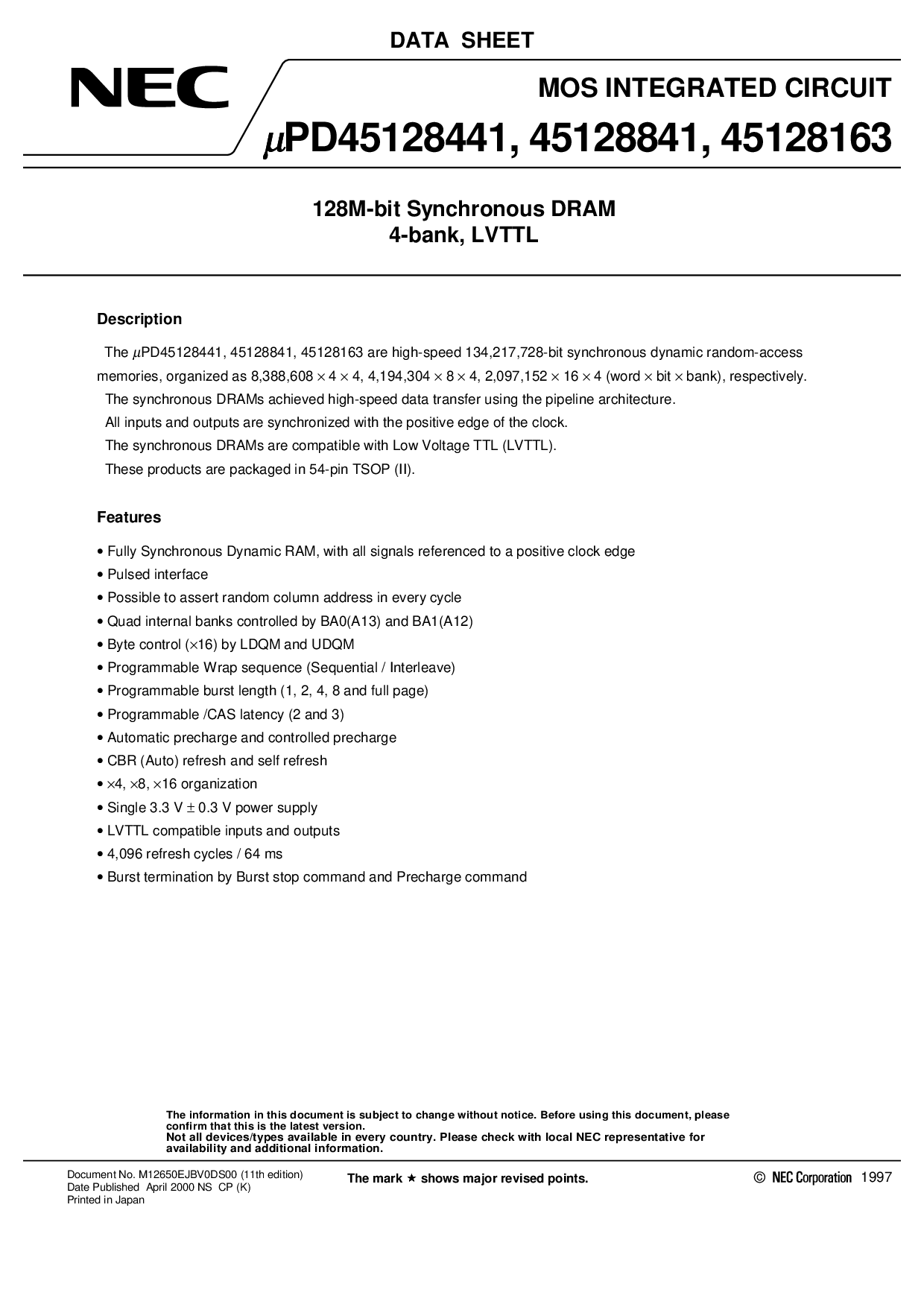 pd45128441, 45128841, 45128163 是 高速 134,217,728-有点 同步 动态 随机访问