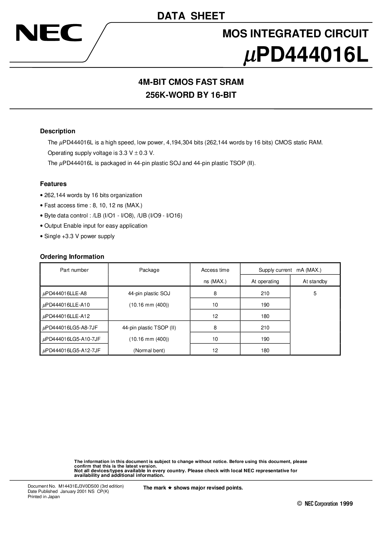 pd444016l 是 一个 高 速度, 低 电源, 4,194,304 比特 (262,144 字词 由 16 bits) cmos 静态 ram.