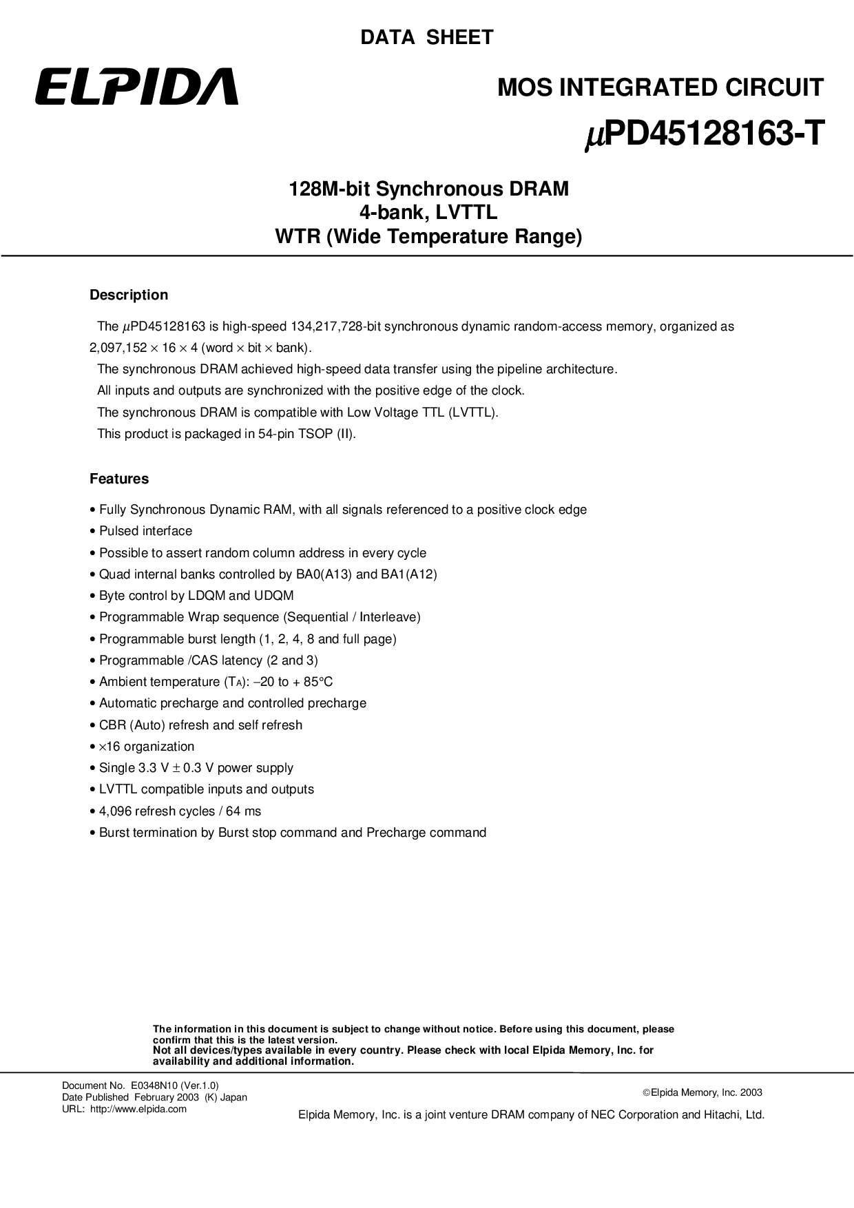 128M-bit Synchronous DRAM 4-bank, LVTTL WTR (Wide Temperature Range)