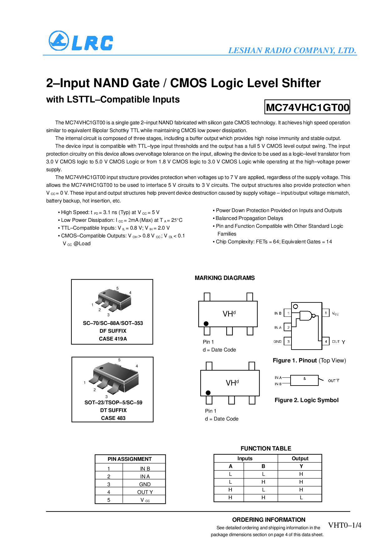 这 mc74vhc1gt00 是 一个 单独 闸门 2–input 与非 预制 与 硅 闸门 cmos 技术. 它 达到 高 速度 操作