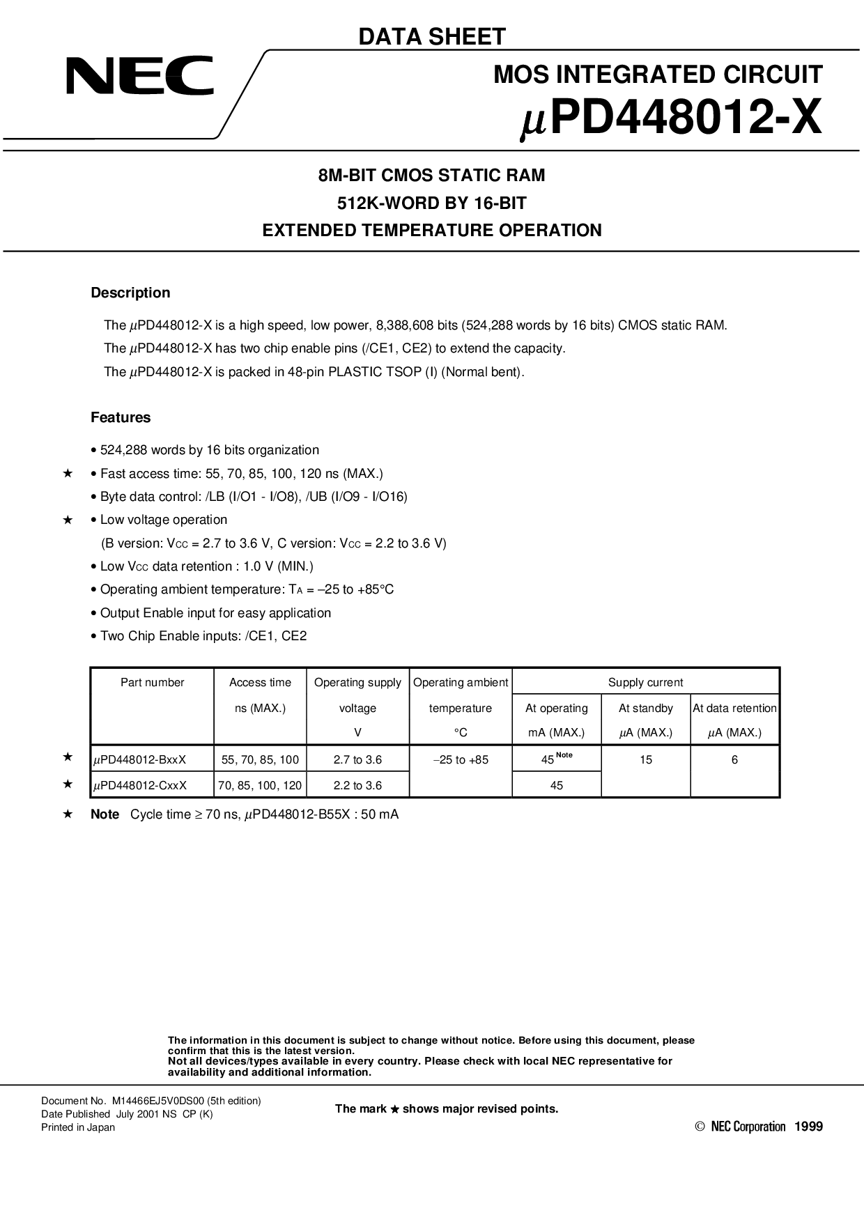 pd448012-x 是 一个 高 速度, 低 电源, 8,388,608 比特 (524,288 字词 由 16 bits) cmos 静态 ram.