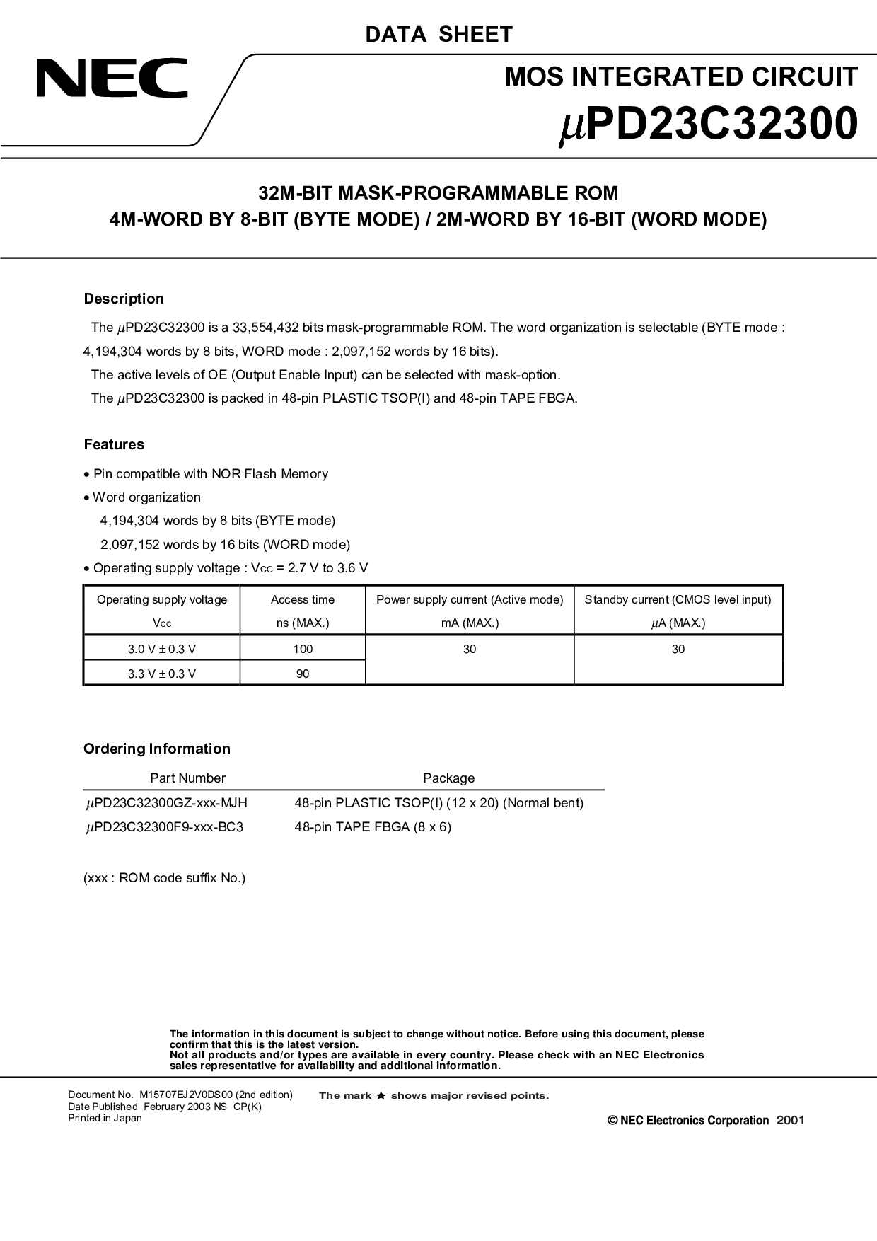 pd23c32300 是 一个 33,554,432 比特 掩模可编程 rom. 这 字 组织机构 是 可选择 (字节 模式 :