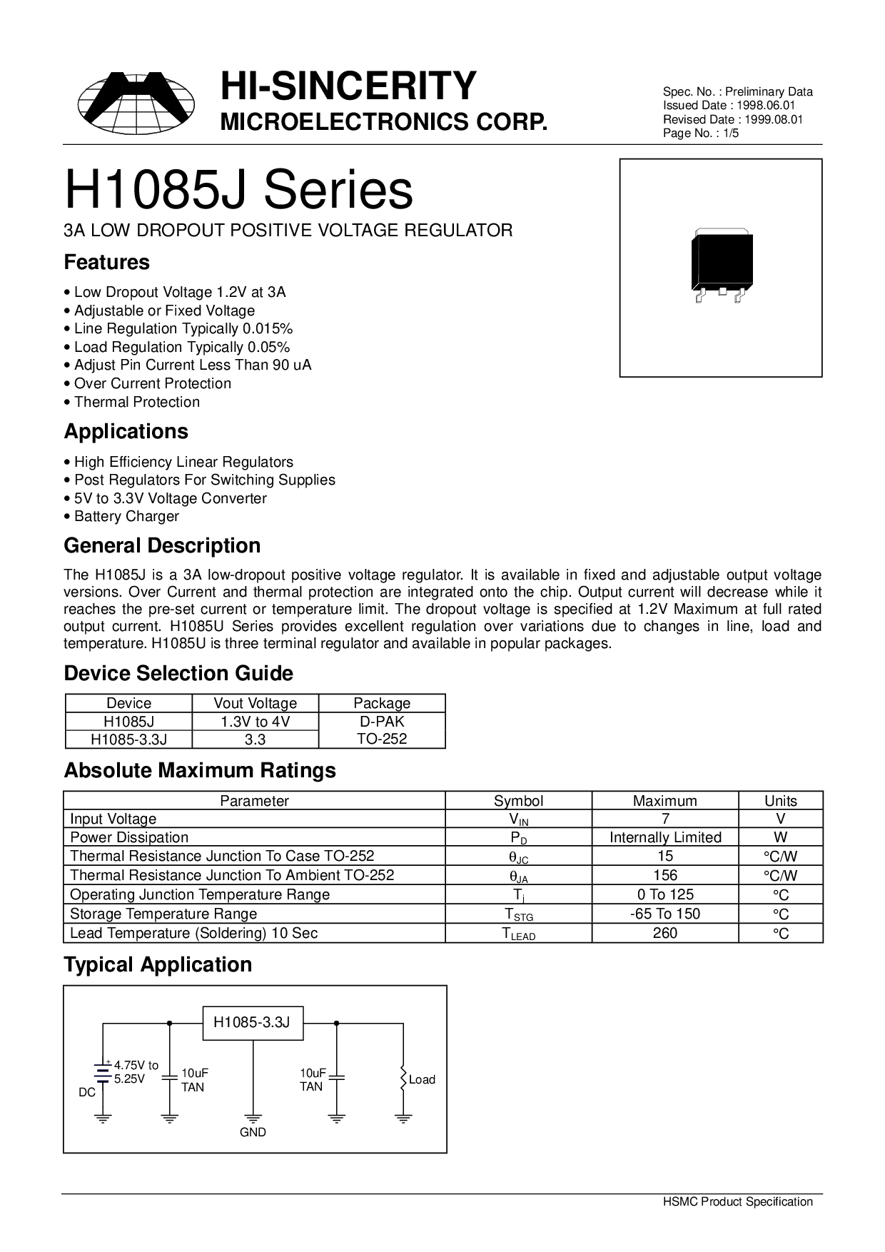 这 h1085j 是 一个 3a 低压差 正 电压 调节器. 它 是 可用 入点 固定 和 可调 输出 电压