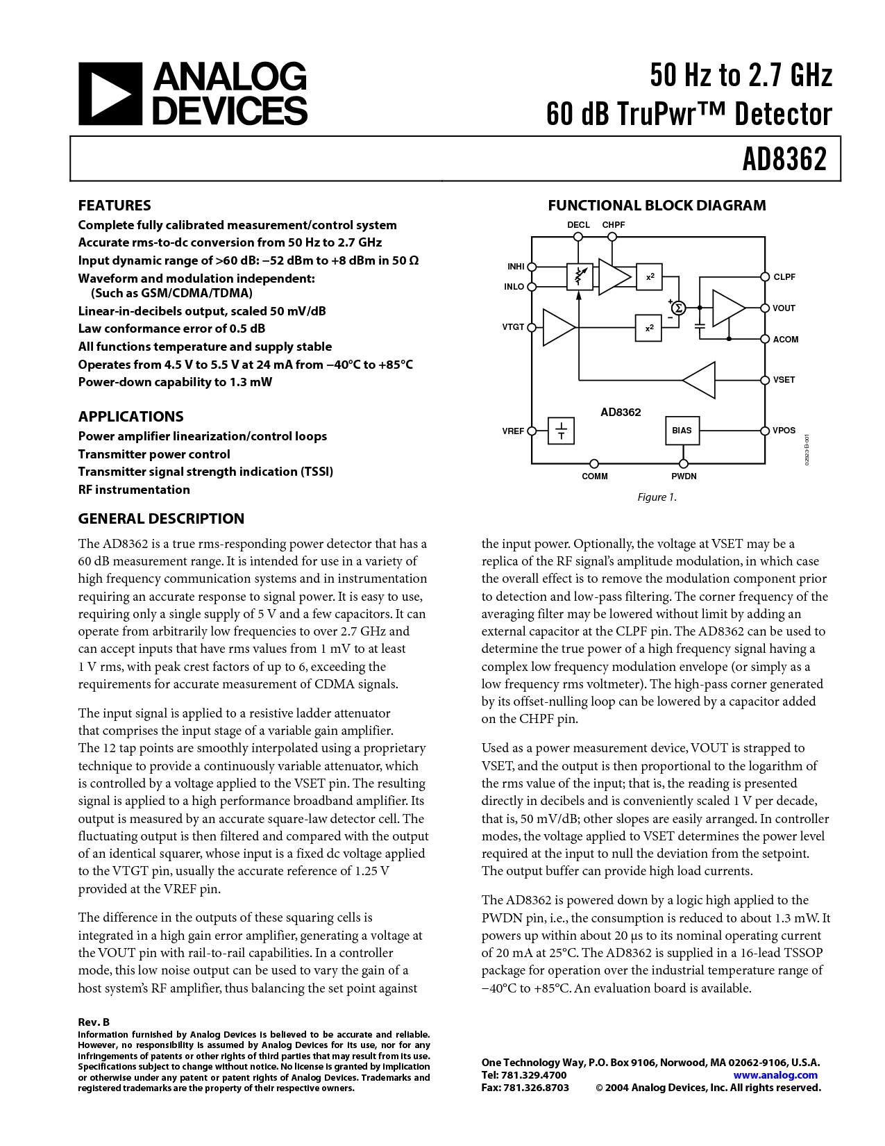 的 20 ma 在 25°c. 这 ad8362 是 提供的 入点 一个 16-铅 tssop