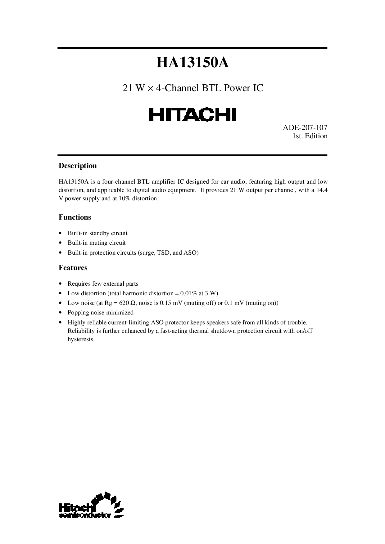 ha13150a 是 一个 四通道 btl 放大器 集成电路 设计 用于 汽车 音频, 特色 高 输出 和 低