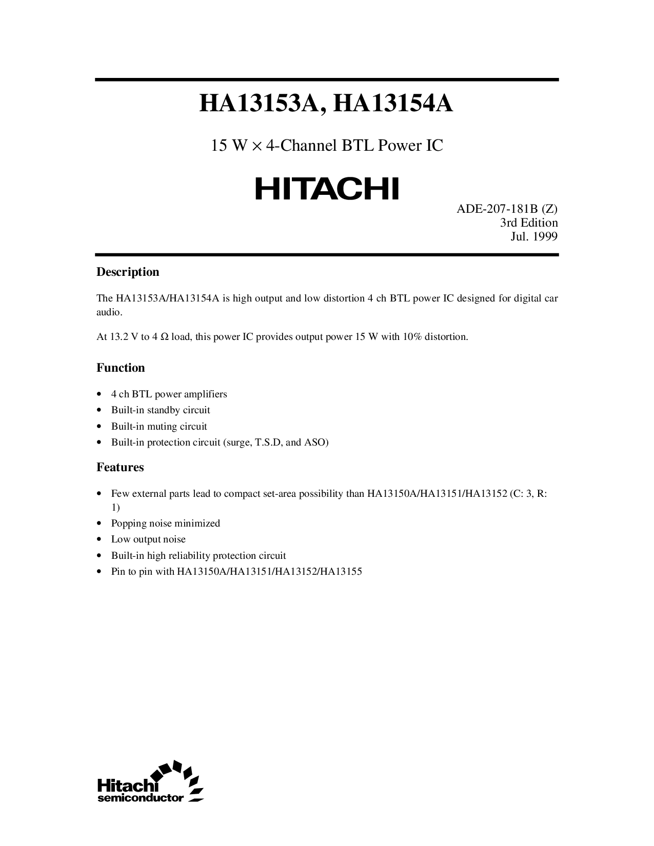 这 ha13153a/ha13154a 是 高 输出 和 低 失真 4 ch btl 电源 集成电路 设计 用于 数字 汽车