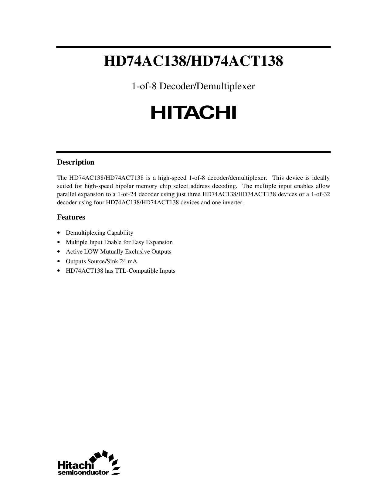 这 hd74ac138/hd74act138 是 一个 高速 1-的-8 解码器/多路分解器. 这个 设备 是 理想情况下
