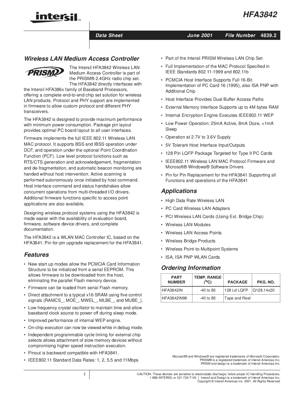 这 HFA3842 是 一个 WLAN mac 控制器 集成电路, 基于 开启 这