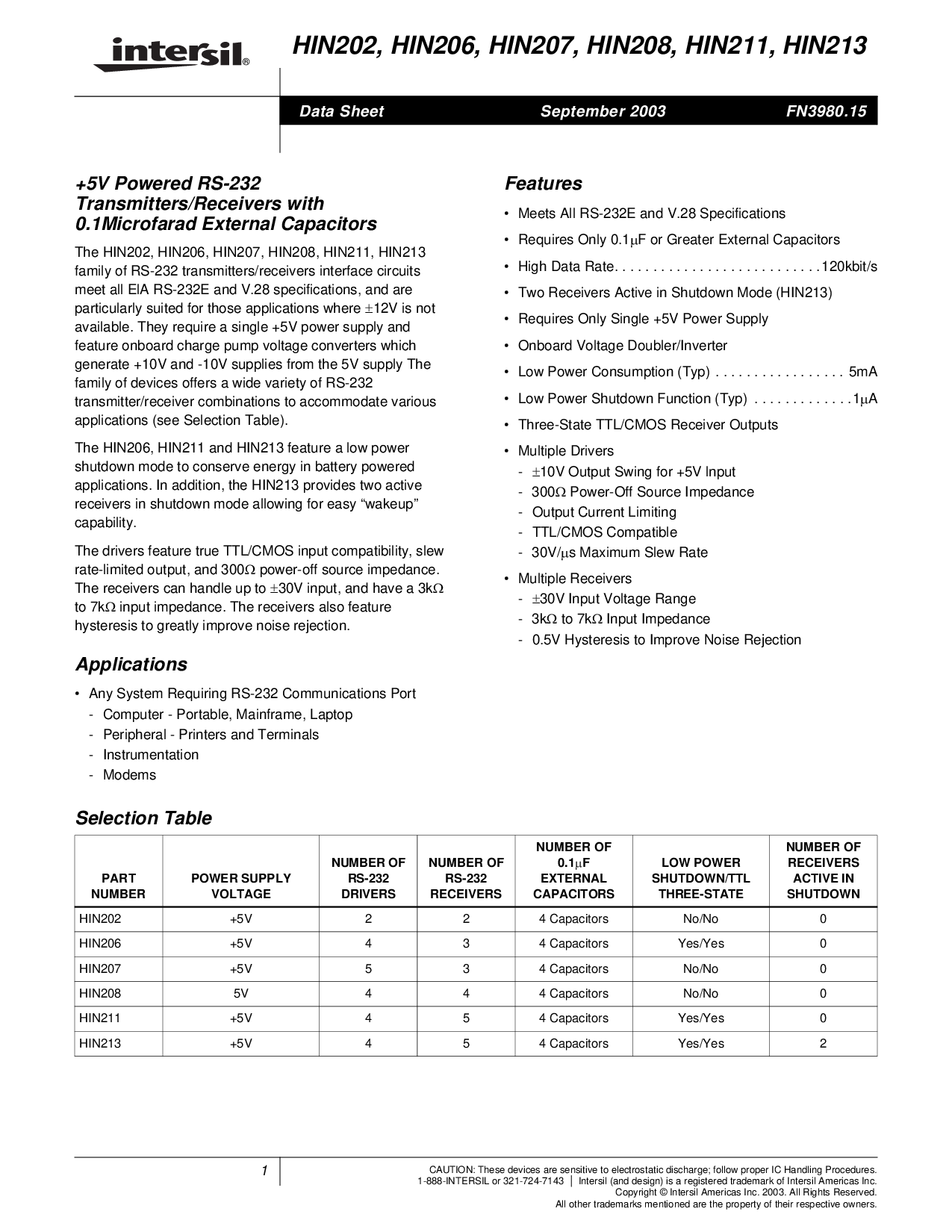 浏览型号HIN213CA的Datasheet PDF文件第3页