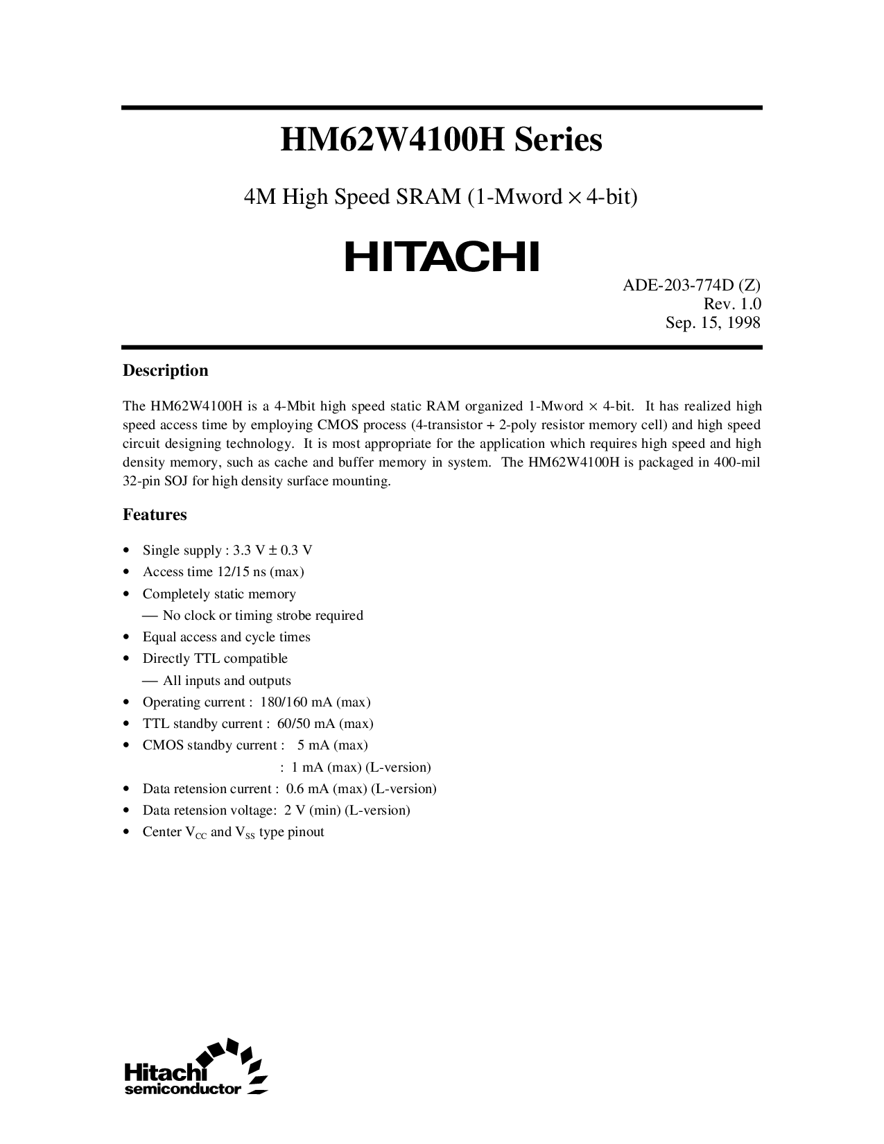 这 hm62w4100h 是 一个 4-mbit 高 速度 静态 ram 有组织的 1-mword