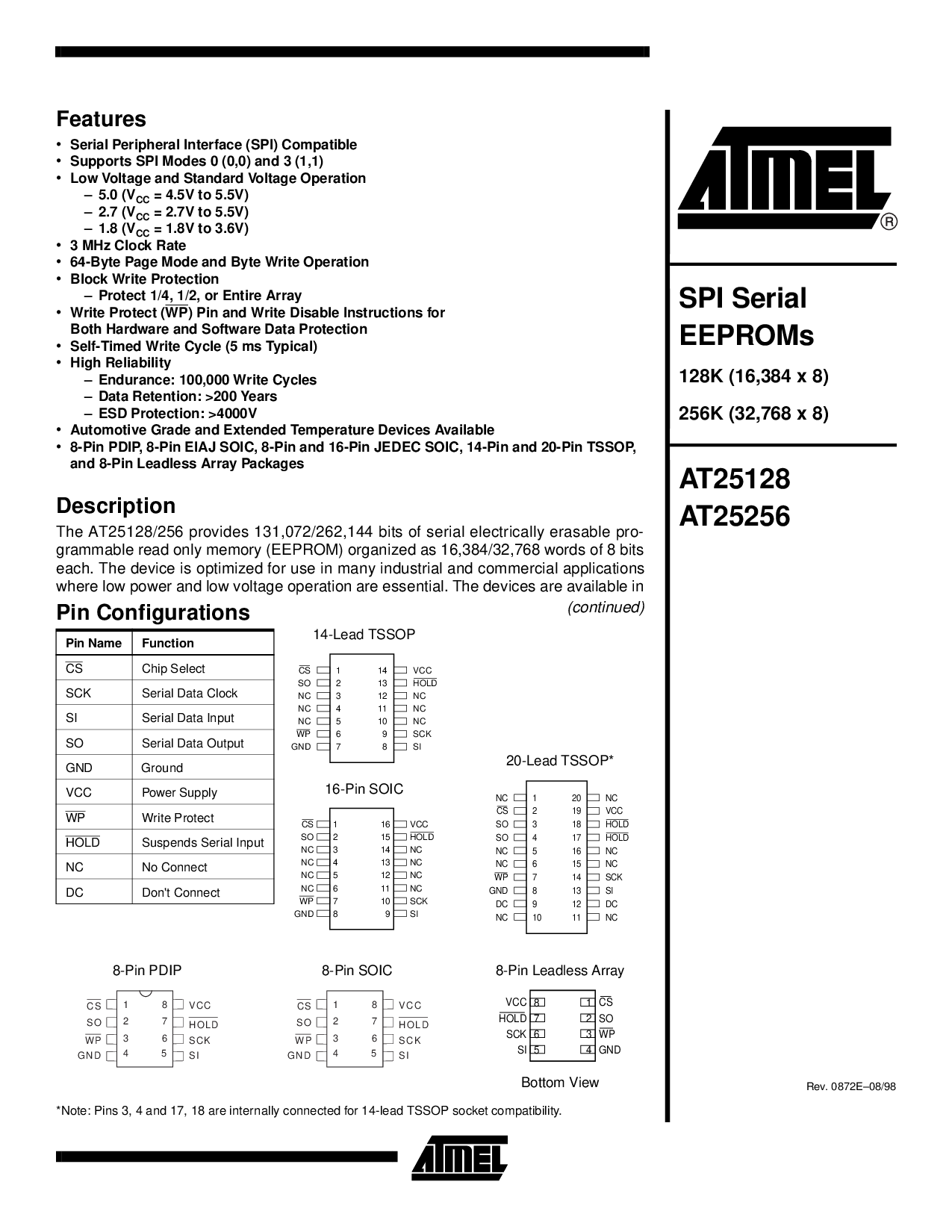 这 at25128/256 提供 131,072/262,144 比特 的 串行 电气 可擦除 专业版-